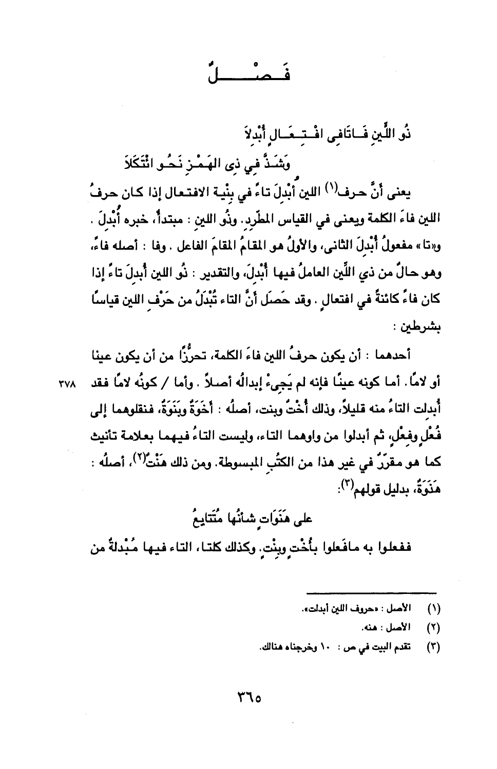 يعني أن حرف اللين أبدل تاء في بنية الافتعال إذا كان حرف اللين فاء الكلمة ويعني في القياس المطرد. وذو اللين: مبتدأ، خبره أبدل. و "تا" مفعول أبدل الثاني، والأول هو المقام المقام الفعل. وفا: اصله فاء، وهو حال من ذي اللين العامل فيها أبدل، والتقدير: ذو اللين أبدل تاء إذا كان فاء كائنة في افتعال. وقد حصل أن التاء تبدل من حرف اللين قياسا بشرطين: