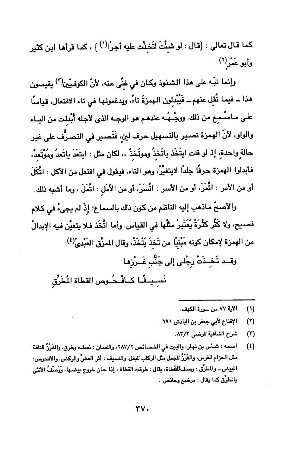 وإنما نبه على هذا الشذوذ وكان في غنى عنه، لأن الكوفيين يقيسون هذا- فيما نقل عنهم- فيبدلون الهمزة تاء، ويدغمونها في تاء الافتعال، قياسا على ما سمع من ذلك. ووجهه عندهم هو الوجه الذي لأجله أبدلت من الياء والواو، لأن الهمزة تصير بالتسهيل حرف لين، فتصير في التصرف على غير حالة واحدة، إذا لو قلت ايتخذ ياتخذ وموتخذ، لكان مثل: ايتعد يا تعد وموتعد، فأبدلوا الهمزة حرفا جلدا لا يتغير، وهو التاء. فيقول في افتعل من الأكل: اتكل أو من الأمر: اتمر، أو من الأسر: اتسر، أو من الأمل: اتمل، وما أشبه ذلك.