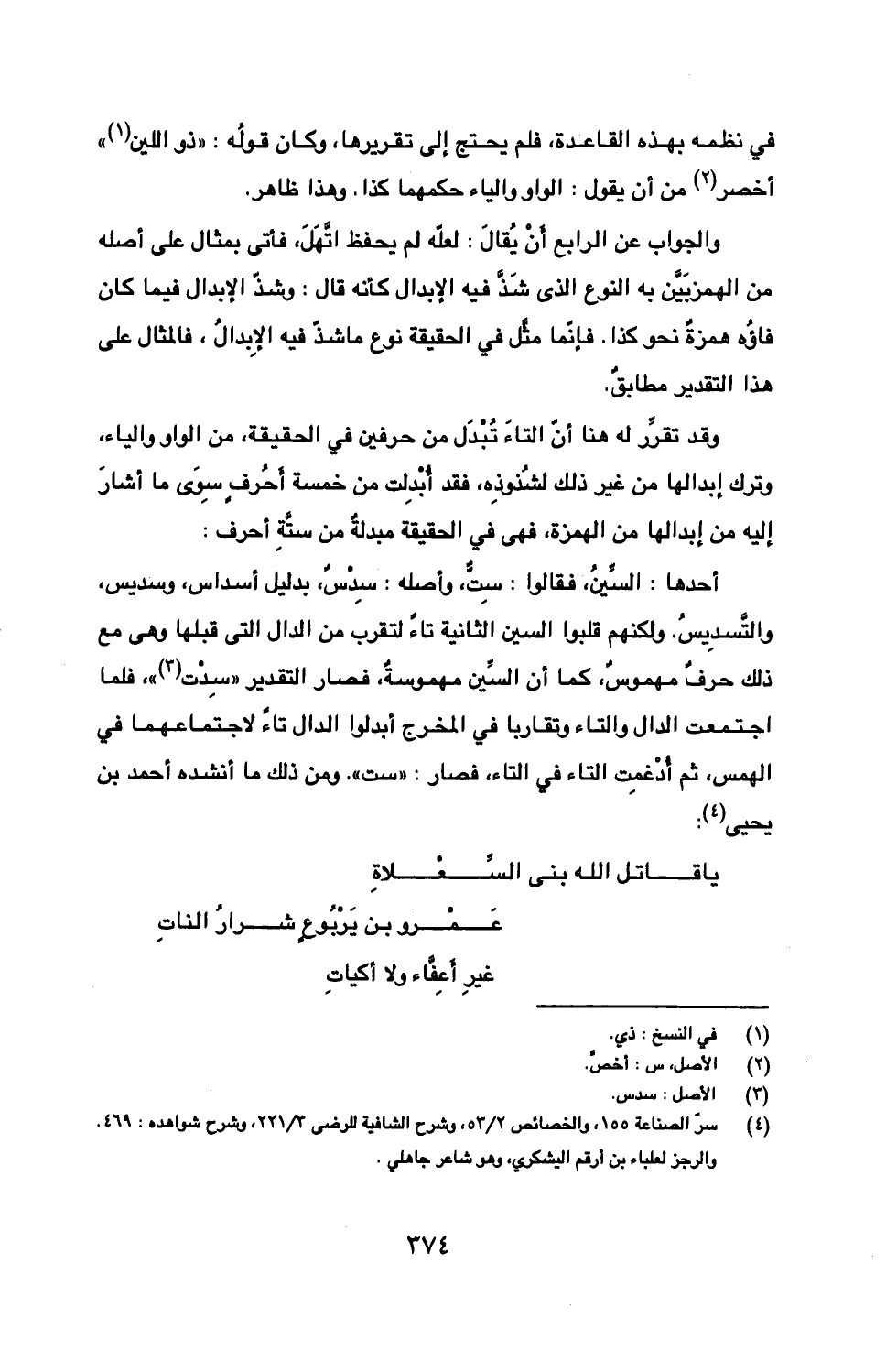 والجواب عن الرابع أن يقال: لعله لم يحفظ اتهل، فأتى بمثال على أصله من الهمزبين به النوع الذي شذ فيه الإبدال كأنه قال: وشذ الإبدال فيما كان فاؤه همزة نحو كذا. فإنما مثل في الحقيقة نوع ما شذ فيه الإبدال، فالمثال على هذا التقدير مطابق.