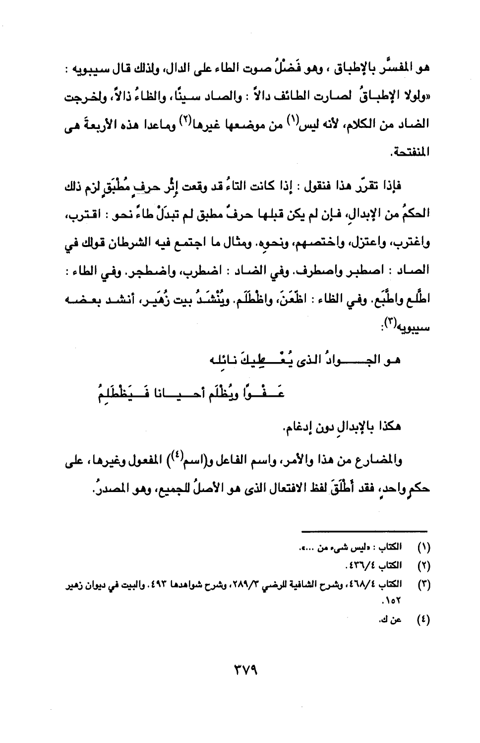 فإذا تقرر هذا فنقول: إذا كانت التاء قد وقعت إثر حرف مطبق لزم ذلك الحكم من الإبدال، فإن لم يكن قبلها حرف مطبق لم تبدل طاء نحو: اقترب، واغترب، واعتزل، واختصهم، ونحوه. ومثال ما اجتمع فيه الشرطان قولك في الصاد: اصطبر واصطرف. وفي الضاد: اضطرب، واضطجر. وفي الطاء: اطلع واطبع. وفي الظاء: اظعن، واظطلم. وينشد بيت زهير، أنشد بعضه سيبويه: