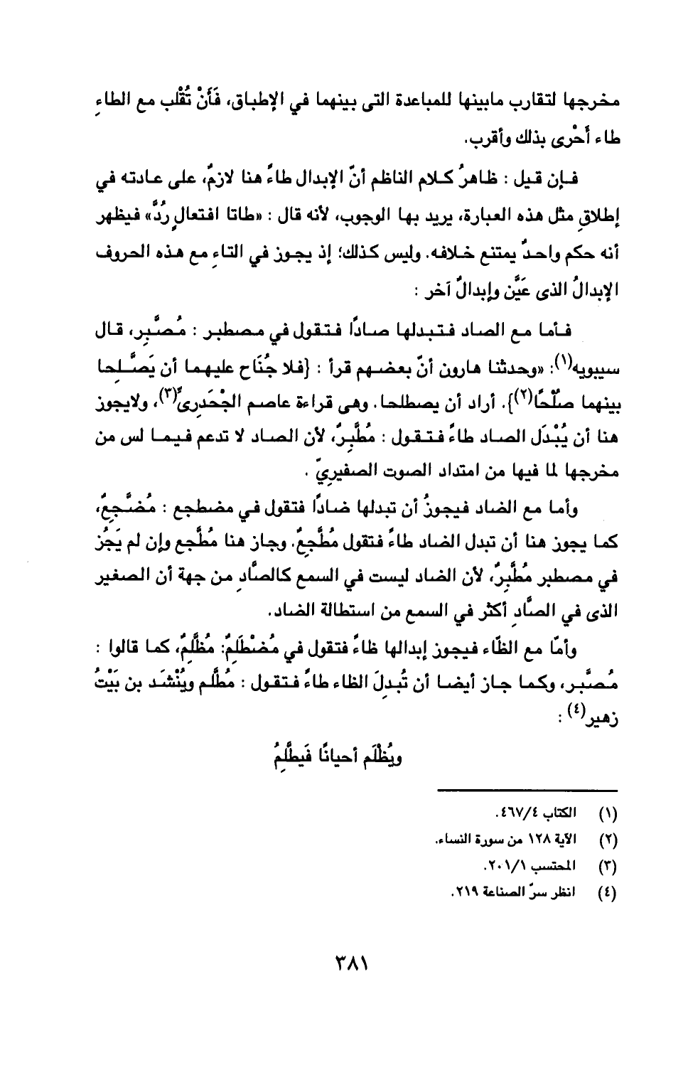 وأما مع الظاء فيجوز إبدالها ظاء فتقول في مضطلم: مظلم، كما قالوا: مصبر، وكما جاز أيضا أن تبدل الظاء طاء فتقول: مطلم وينشد بن بيت زهير: