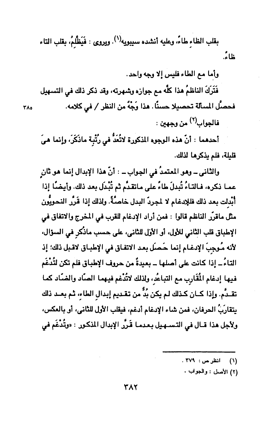 والثاني- وهو المعتمد في الجواب-: أن هذه الإبدال إنما هو ثان عما ذكره، فالتاء تبدل طاء على ما تقدم ثم تبدل بعد ذلك. وأيضا أذا أبدلت بعد ذلك فللإدغام لا لمجرد البدل خاصة. ولذلك إذا قرر النحويون مثل ما قرر الناظم قالوا: فمن أراد الإدغام للقرب في المخرج والاتفاق في الإطباق لا قبل ذلك؛ إذ التاء- إذا كانت على أصلها- بعيدة من حروف الإطباق فلم تكن لتدغم فيها إدغام المقارب مع التباعد، ولذلك لا تدغم فيهما الصاد والضاد كما تقدم. وإذا كان كذلك لم يكن بد من تقديم إبدال الطاء، ثم بعد ذلك يتقارب الحرفان، فمن شاء الإدغام أدغم، فيقلب الأول للثاني، أو بالعكس، ولأجل هذا قال في التسهيل بعدما قرر الإبدال المذكور: "وتدغم في
