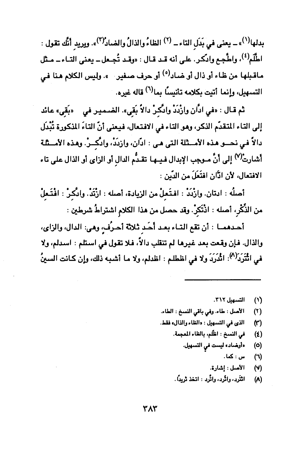 بدلها"- يعني في بدل التاء- الظاء والذال والضاد". ويريد أنك تقول: اطلم، واطجع وادكر. على أنه قد قال: "وقد تجعل- يعني التاء- مثل ما قبلها من ظاء أو ذال أو ضاد أو حرف صغير". وليس الكلام هنا في التسهيل، وإنما أتيت بكلامه تأنيسا بما قاله غيره.