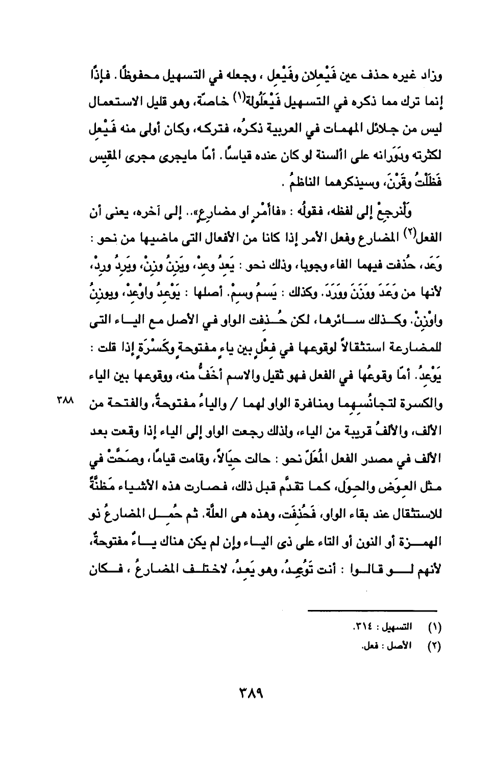 ولنرجع إلى لفظه، فقوله: "فا أمر أو مضارع" .. إلى آخره، يعني ان الفعل المضارع وفعل الأمر إذا كانا من الأفعال التي ماضيها من نحو: وعد، حذفت فيهما الفاء وجوبا، وذلك نحو: يعد وعد، ويزن وزن، ويرد ورد، لأنها من وعد ووزن وورد. وكذلك: يسم وسم. أصلها: يوعد واوعد، ويوزن واوزن، وكذلك سائرها، لكن حذفت الواو في الأصل مع الياء التي للمضارعة استثقالا لوقوعها في فعل بين ياء مفتوحة وكسرة إذا قلت: يوعد. أما وقوعها في الفعل فهو ثقيل والاسم أخف منه، ووقوعها بين الياء والكسرة لتجانسهما ومنافرة الواو لهما/ والياء مفتوحة، والفتحة من الألف، والألف قريبة من الياء، ولذلك رجعت الواو إلى الياء إذا وقعت بعد الألف في مصدر الفعل المعل نحو: حالت حيالا، وقامت قياما، وصحت في مثل العوض والحول، كما تقدم قبل ذلك، فصارت هذه الأشياء مظنة للاستثقال عند بقاء الواو، فحذفت، وهذه هي العلة. ثم حمل المضارع ذو الهمزة أو النون أو التاء على ذي الياء وإن لم يكن هناك ياء مفتوحة، لأنهم لو قالوا: أنت توعد، وهو يعد، لاختلف المضارع، فكان