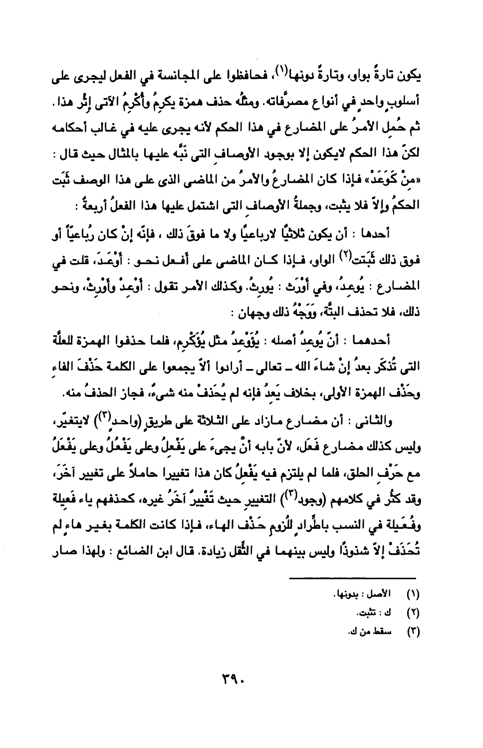 أحدها: أن يكون ثلاثيا لا رباعيا ولا ما فوق ذلك، فإنه إن كان رباعيا أو فوق ذلك ثبتت الواو، فإذا كان الماضي على أفعل نحو: أوعد، قلت في المضارع: يوعد، وفي أورث: يورث. وكذلك الأمر تقول: أوعد وأورث، ونحو ذلك، فلا تحذف البتة، ووجه ذلك وجهان: