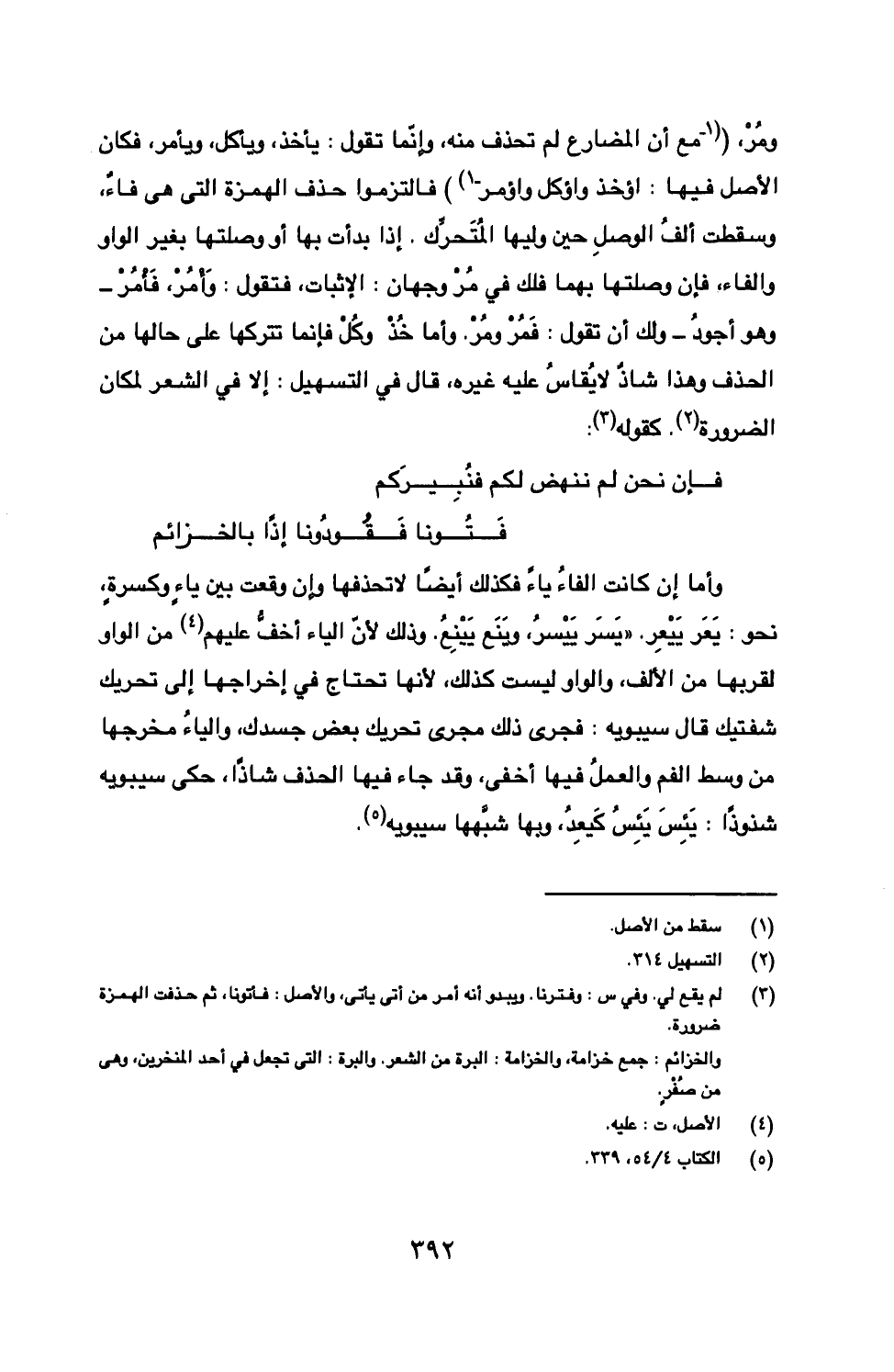 ومر، (مع أن المضارع لم تحذف منه، وإنما تقول: يأخذ، ويأكل، ويأمر، فكان الأصل فيها: اؤخذ واؤكل واؤمر) فالتزموا حذف الهمزة التي هي فاء، وسقطت ألف الوصل حين وليها المتحرك. إذا بدأت بها أو وصلتها بغير الواو والفاء، فإن وصلتها بهما فل في مر وجهان: الأثبات، فتقول: وأمر، فأمر- وهو أجود- ولك أن تقول: فمر ومر. وأما خذ وكل فإنما تتركها على حالها من الحذف وهذا شاذ لا يقاس عليه غيره، قال في التسهيل: إلا في الشعر لمكان الضرورة. كقوله: