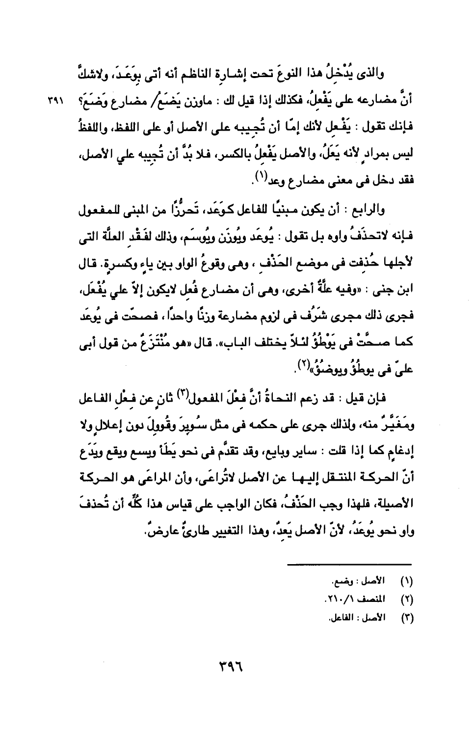 والرابع: أن يكون مبنيا للفاعل كوعد، تحرزا من المبنى للمفعول فإنه لا تحذف واوه بل تقول: يوعد ويوزن ويوسم، وذلك لفقد العلة التي لأجلها حذفت في موضع الحذف، وهي وقوع الواو بين ياء وكسرة. قال ابن جنى: "وفيه علة أخرى، وهى أن مضارع فعل لا يكون إلا علي يفعل، فجرى ذلك مجرى شرف في لزوم مضارعة وزنا واحدا، فصحت في يوعد كما صحت في يوطؤ لئلا يختلف الباب". قل "هو منتزع من قول أبي على في يوطؤ ويوضؤ".
