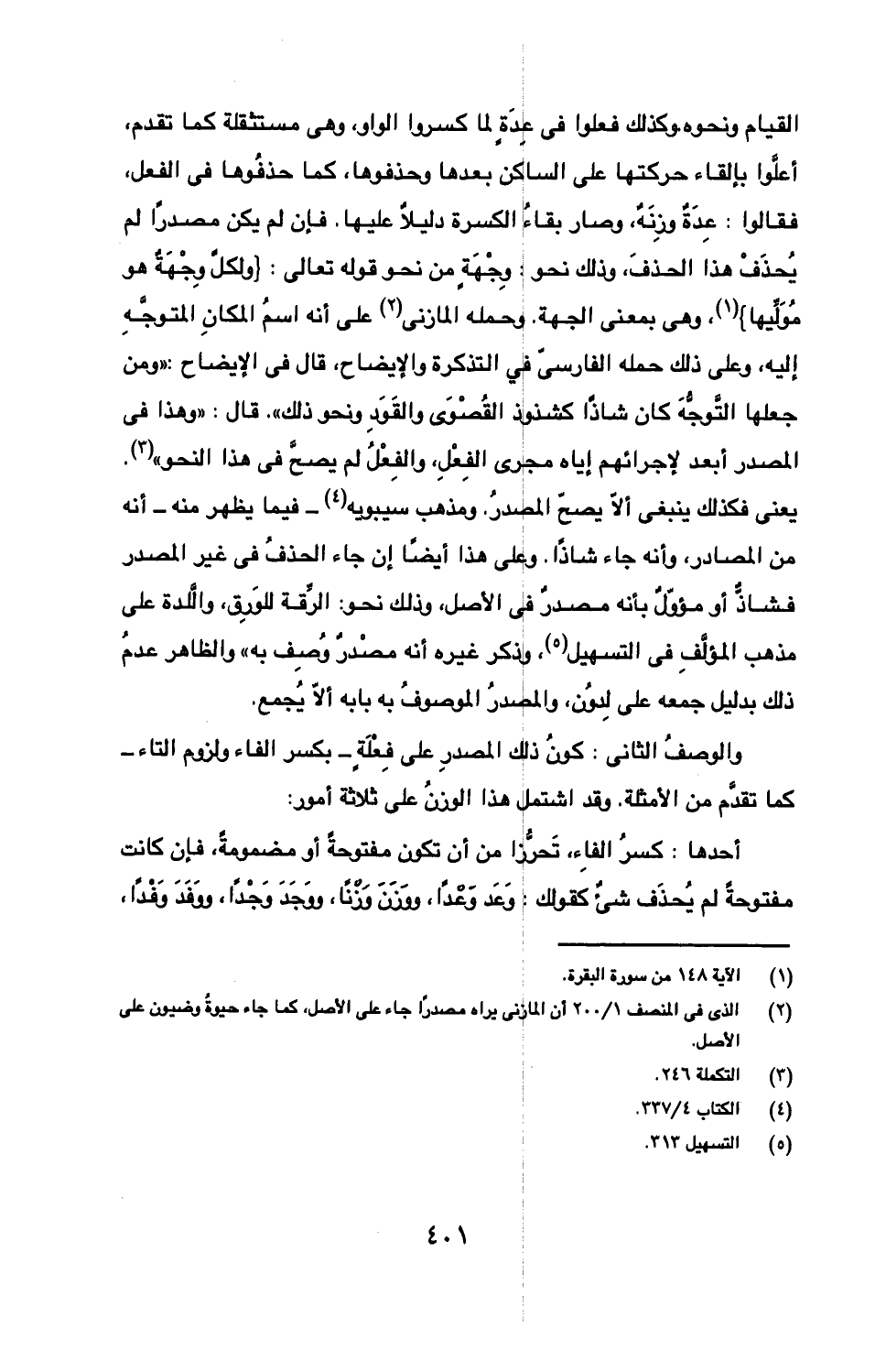 القيام ونحوه. وكذلك فعلوا في عدة لما كسروا الواو، وهي مستثقلة كما تقدم، أعلوا بإلقاء حركتها على الساكن بعدها وحذفوها، كما حذفوها في الفعل، فقالوا: عدة وزنه، وصار بقاء الكسرة دليلا عليها. فإن لم يكن مصدرا لم يحذف هذا الحذف، وذلك نحو: وجهة من نحو قوله تعالى: {ولكل وجهة هو موليها}، وهي بمعنى الجهة. وحمله المازني على أنه اسم المكان المتوجه إليه، وعلى ذلك حمله الفارسي في التذكرة والإيضاح، قال في الإيضاح: "ومن جعلها التوجه كان شاذا كشذوذ القصوى والقود ونحو ذلك". قال: "وهذا في المصدر أبعد لإجرائهم إياه مجرى الفعل، والفعل لم يصح في هذا النحو" يعني فكذلك ينبغي ألا يصح المصدر. ومذهب سيبويه- فيما يظهر منه- أنه من المصادر، وأنه جاء شاذا. وعلى هذا أيضا إن جاء الحذف في غير المصدر فشاذ أو مؤول بأنه مصدر في الأصل، وذلك نحو: "الرقة للورق، واللدة على مذهب المؤلف في التسهيل، وذكر غيره أنه مصدر وصف به" والظاهر عدم ذلك بدليل جمعه على لدون، والمصدر الموصوف به بابه ألا يجمع.