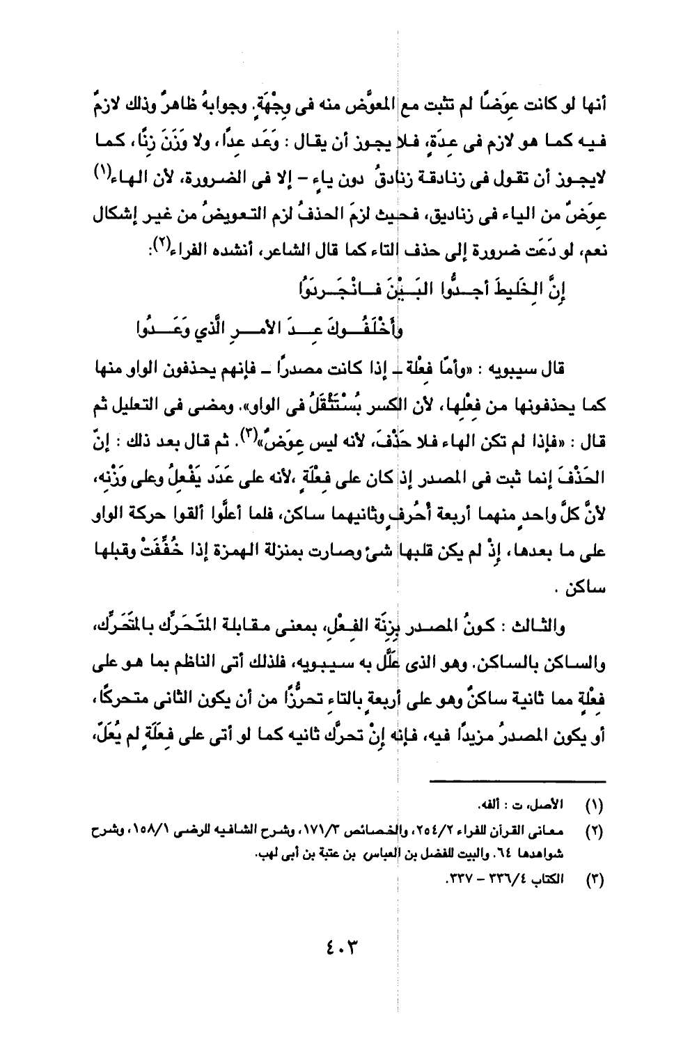 أنها لو كانت عوضا لم تثبت مع المعوض منه في وجهة. وجوابه به ظاهر وذلك لازم فيه كما هو لازم في عدة، فلا يجوز أن يقال: وعد عدا، ولا وزن زنا، كما لا يجوز أن تقول في زنادقة زنادق دون ياء- إلا في الضرورة، لأن الهاء عوض من الياء في زناديق، فحيث لزم الحذف لزم التعويض من غير إشكال نعم، لو دعت ضرورة إلى حذف التاء كما قال الشاعر، أنشده الفراء: