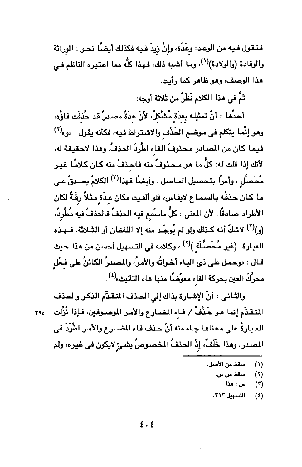 أحدها: أن تمثيله بعدة مشكل، لأن عدة مصدر قد حذفت فاؤه، وهو إنما يتكلم في موضع الحذف والاشتراط فيه، فكأنه يقول: "و" فيما كان من المصادر محذوف الفاء اطرد الحذف. وهذا لا حقيقة له، لأنك إذا قلت له: كل ما هو محذوف منه فاحذف منه كان كلاما غير محصل، وأمرا بتحصيل الحاصل. وأيضا فهذا الكلام يصدق على ما كان حذفه بالسماع لا يقاس، فلو ألقيت مكان عدة مثلا رقة لكان الأطراد صادقا، لأن المعنى: كل ما سمع فيه الحذف فالحذف فيه مطرد، (و) لاشك أنه كذلك ولو لو يوجد منه إلا اللفظان أو الثلاثة. فهذه العبارة (غير محصلة)، وكلامه في التسهيل أحسن من هذا حيث قال: "وحمل على ذي الياء أخواته والأمر، والمصدر الكائن على فعل محرك العين بحركة الفاء معوضا منها هاء التأنيث".