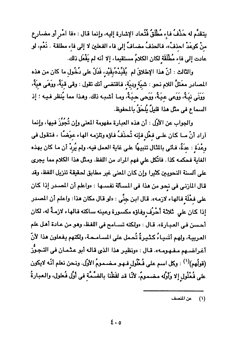والجواب عن الأول: أن هذه العبارة مفهومة المعنى وإن تجوز فيها، وإنما أراد أن ما كان على فعل فإنه تحذف فاؤه وتلزمه الهاء عوضا، فتقول في وعدة: عدة، فأتى بالمثال تنبيها على غاية العمل فيه، ولم يرد أن ما كان بهذه الغاية فحكمه كذا. فاتكل على فهم المراد من اللفظ. ومثل هذا الكلام مما يجري على ألسنة النحويين كثيرا وإن كان المعنى غير مطابق لحقيقة تنزيل اللفظ، وقد قال المازني في نحو من هذا في المسألة نفسها: "واعلم أن المصدر إذا كان على فعلة فالهاء لازمه". قال ابن جني: "لو قال مكان هذا: واعلم أن المصدر إذا كان على ثلاثة أحرف وفاؤه مكسورة وعينه ساكنه فالهاء لازمة له، لكان أحسن في العبارة". قال: "ولكنه تسامح في اللفظ، وهو من عادة أهل علم العربية، ولهم أشياء كثيرة تحمل على المسامحة، ولكنهم يفعلون هذا لأن أغراضهم مفهومة". قال: "ونظير هذا الذي قاله أبو عثمان في التجوز (قولهم): وكل اسم على فعلول فهو مضموم الأول. ونحن نعلم أنه لا يكون على فعلول إلا وأوله مضموم، لأنا قد لفظنا بالضمة في أول فعلول، والعبارة