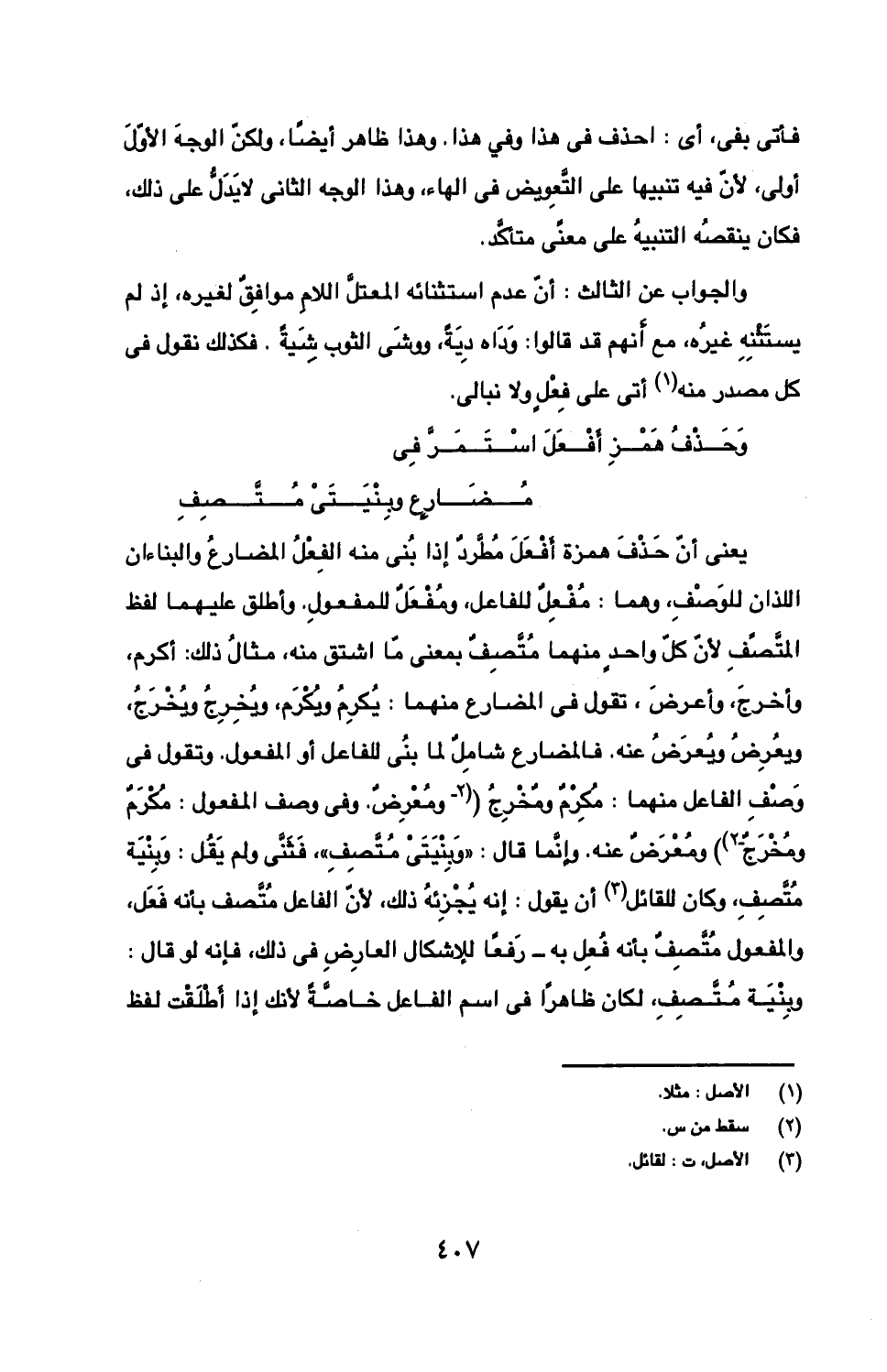 يعني أن حذف همزة أفعل مطرد إذا بني منه الفعل المضارع والبناءان اللذان للوصف، وهما: مفعل للفاعل، ومفعل للمفعول. وأطلق عليهما لفظ المتصف لأن كل واحد منهما متصف بمعنى ما اشتق منه، مثال ذلك: أكرم، وأخرج، وأعرض، تقول في المضارع منهما: يكرم ويكرم، ويخرج ويخرج، ويعرض ويعرض عنه. فالمضارع شامل لما بني للفاعل أو المفعول. وتقول في وصف الفاعل منهما: مكرم ومخرج (ومعرض. وفي وصف المفعول: مكرم ومخرج) ومعرض عنه. وإنما قال: "وبنيتي متصف"، فثنى ولم يقل: وبنية متصف، وكان للقائل أن يقول: إنه يجزئه ذلك، لأن الفاعل متصف بأنه فعل، والمفعول متصف بأنه فعل به- رفعا للإشكال العارض في ذلك، فإنه لو قال: وبنية متصف، لكان ظاهرا في اسم الفاعل خاصة لأنك إذا أطلقت لفظ
