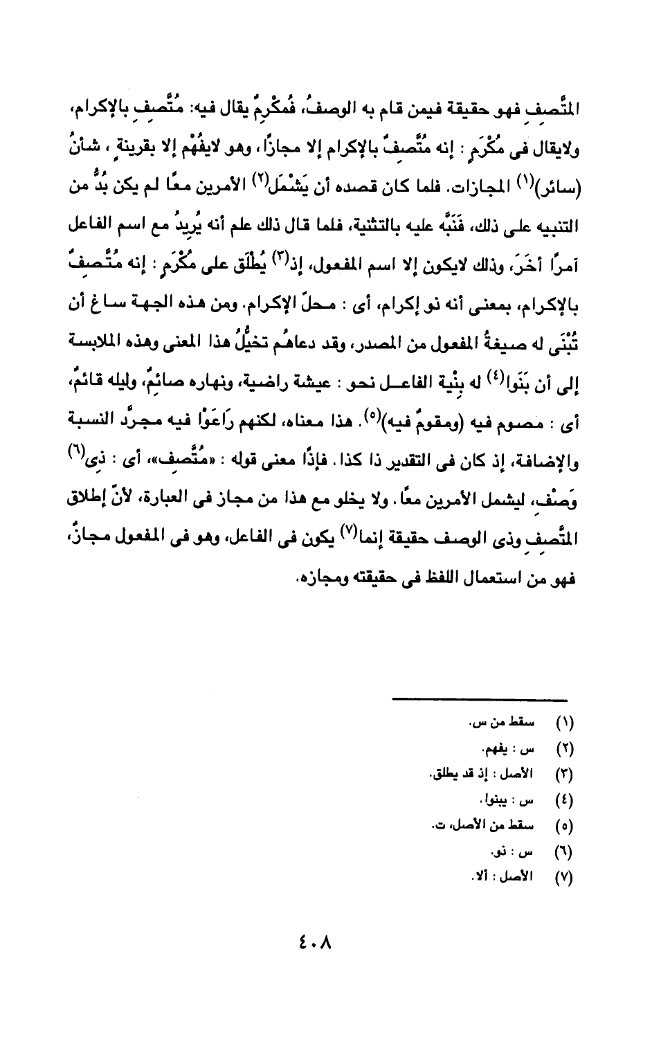 المتصف فهو حقيقة فيمن قام به الوصف، فمكرم يقال فيه: متصف بالإكرام، ولا يقال في مكرم: إنه متصف بالإكرام إلا مجازا، وهو لا يفهم إلا بقرينة، شأن (سائر) المجازات. فلما كان قصده أن يشمل الأمرين معا لم يكن بد من التنبيه على ذلك، فنبه عليه بالتثنية، فلما قال ذلك علم أنه يريد مع اسم الفاعل آمرا أخر، وذلك لا يكون إلا اسم المفعول، إذ يطلق على مكرم: إنه متصف بالإكرام، بمعنى أنه ذو إكرام، أي: محل الإكرام. ومن هذه الجهة ساغ أن تبنى له صيغة المفعول من المصدر، وقد دعاهم تخيل هذا المعنى وهذه الملابسة إلى أن بنوا له بنية الفاعل نحو: عيشة راضية، ونهاره صائم، وليله قائم، أي: مصوم فيه (ومقوم فيه). هذا معناه، لكنهم راعوا فيه مجرد النسبة والإضافة، إذ كان في التقدير ذا كذا. فإذا معنى قوله: "متصف"، أي: ذي وصف، ليشمل الأمرين معا. ولا يخلو مع هذا من مجاز في العبارة، لأن إطلاق المتصف وذي الوصف حقيقة إنما يكون في الفاعل، وهو في المفعول مجاز، فهو من استعمال اللفظ في حقيقته ومجازه.