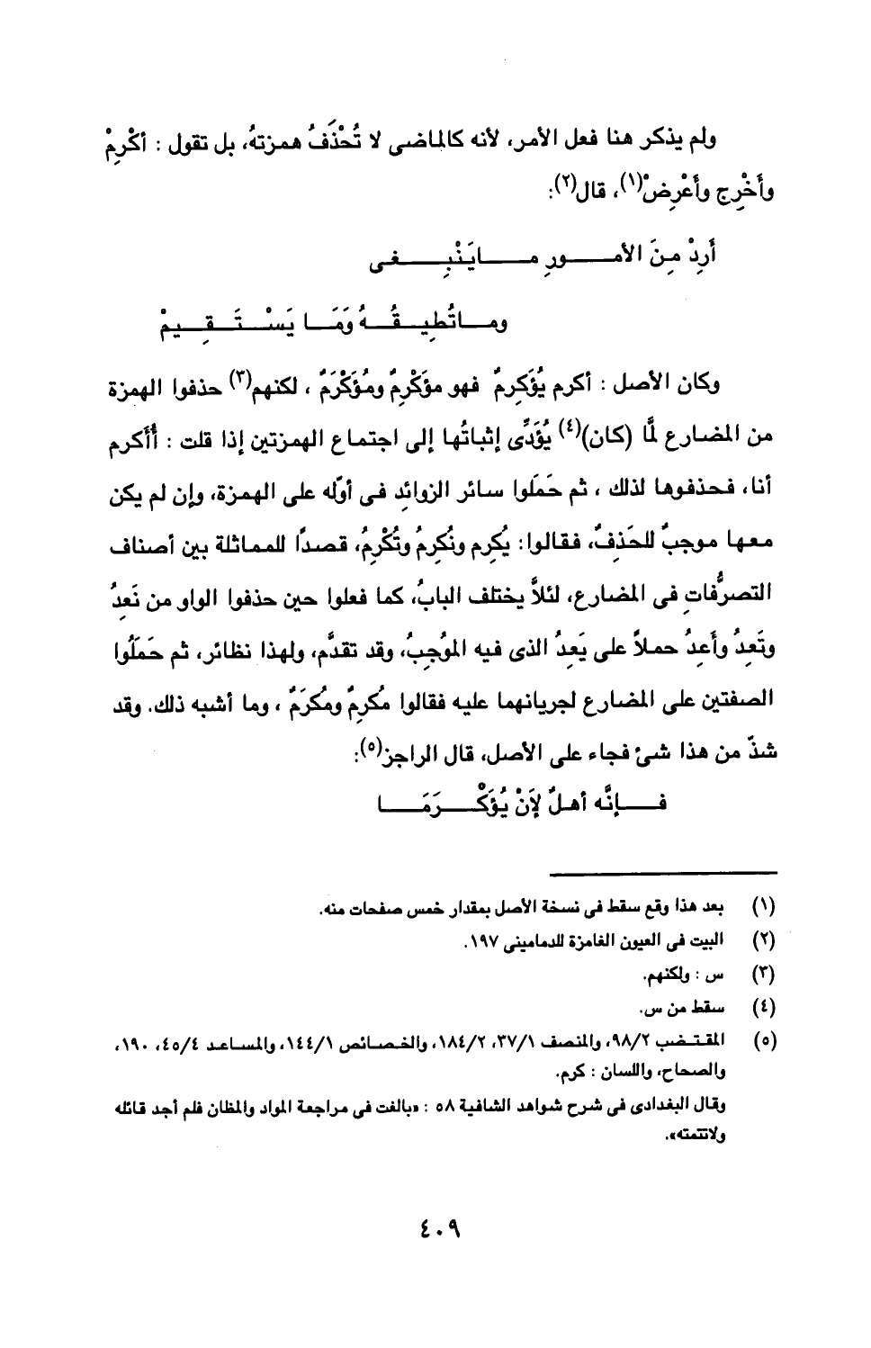 وكان الأصل: أكرم يؤكرم فهو مؤكرم ومؤكرم، لكنهم حذفوا الهمزة من المضارع لما (كان) يؤدى إثباتها إلى اجتماع الهمزتين إذا قلت: أأكرم أنا، فحذفوها لذلك، ثم حملوا سائر الزوائد في أوله على الهمزة، وإن لم يكن معها موجب للحذف، فقالوا: يكرم ونكرم وتكرم، قصدا للمماثلة بين أصناف التصرفات في المضارع، لئلا يختلف الباب، كما فعلوا حين حذفوا الواو من نعد وتعد وأعد حملا على يعد الذي فيه الموجب، وقد تقدم، ولهذا نظائر، ثم حملوا الصفتين على المضارع لجريانهما عليه فقالوا مكرم ومكرم، وما أشبه ذلك. وقد شذ من هذا شيء فجاء على الأصل، قال الراجز: