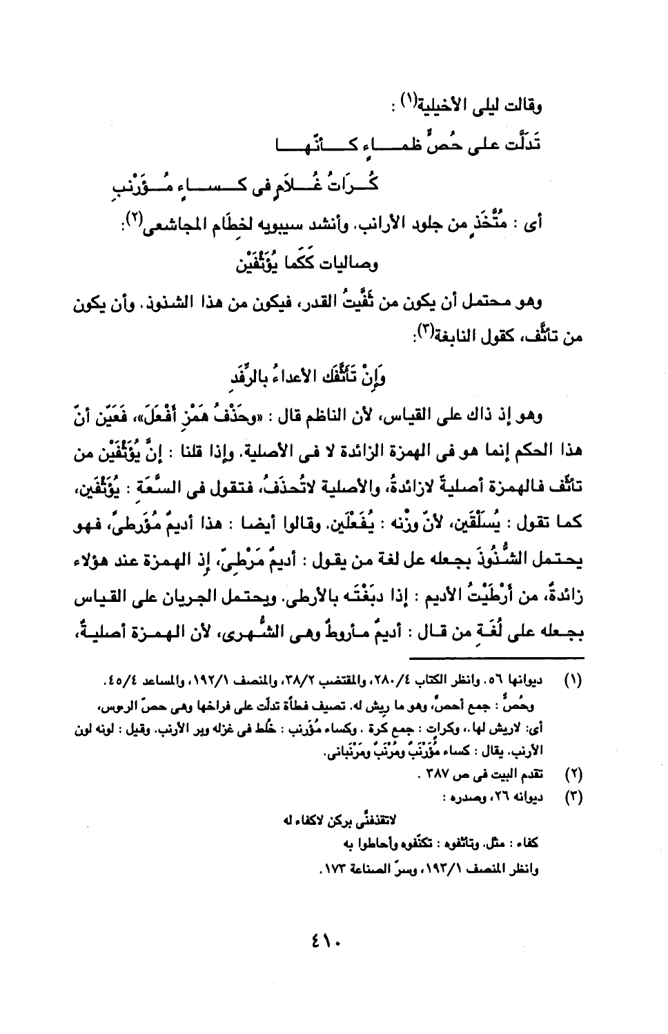 وهو إذ ذاك على القياس، لأن الناظم قال: "وحذف همز أفعل"، فعين أن هذا الحكم إنما هو في الهمزة الزائدة لا في الأصلية. وإذا قلنا: إن يؤثفين من تأثف فالهمزة أصلية لا زائدة، والأصلية لا تحذف، فتقول في السعة: يؤثفين، كما تقول: يسلقين، لأن وزنه: يفعلين. وقالوا أيضا: هذا أديم مؤرطى، فهو يحتمل الشذوذ بجعله على لغة من يقول: أديم مرطى، إذ الهمزة عند هؤلاء زائدة، من أرطيت الأديم: إذا دبغته بالأرطى. ويحتمل الجريان على القياس بجعله على لغة من قال: أديم مأروط وهي الشهري، لأن الهمزة أصلية،