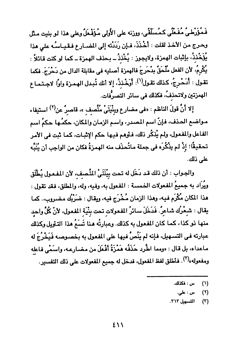 والجواب: أن ذلك قد دخل له تحت بينتي المتصف، لأن المفعول يطلق ويراد به جميع المفعولات الخمسة: المفعول به، وفيه، وله، والمطلق، فقد تقول: هذا المكان مكرم فيه، وهذا الزمان مخرج فيه، ويقال: ضربك مضروب، . كما يقال: شعرك شاعر. فدخل سائر المفعولات تحت بنية المفعول، لأن كل واحد منها ذو كذا، كما كان المفعول به كذلك. وعبارته هنا تسع هذا التأويل وكذلك عبارته في التسهيل، فإنه لم ينص فيها على المفعول به بخصوصه فيخرج له ما عداه، بل قال: "ومما اطرد حذفه همزة أفعل من مضارعه، واسمى فاعله ومفعوله". فأطلق لفظ المفعول، فدخل له جميع المفعولات على ذلك التفسير.