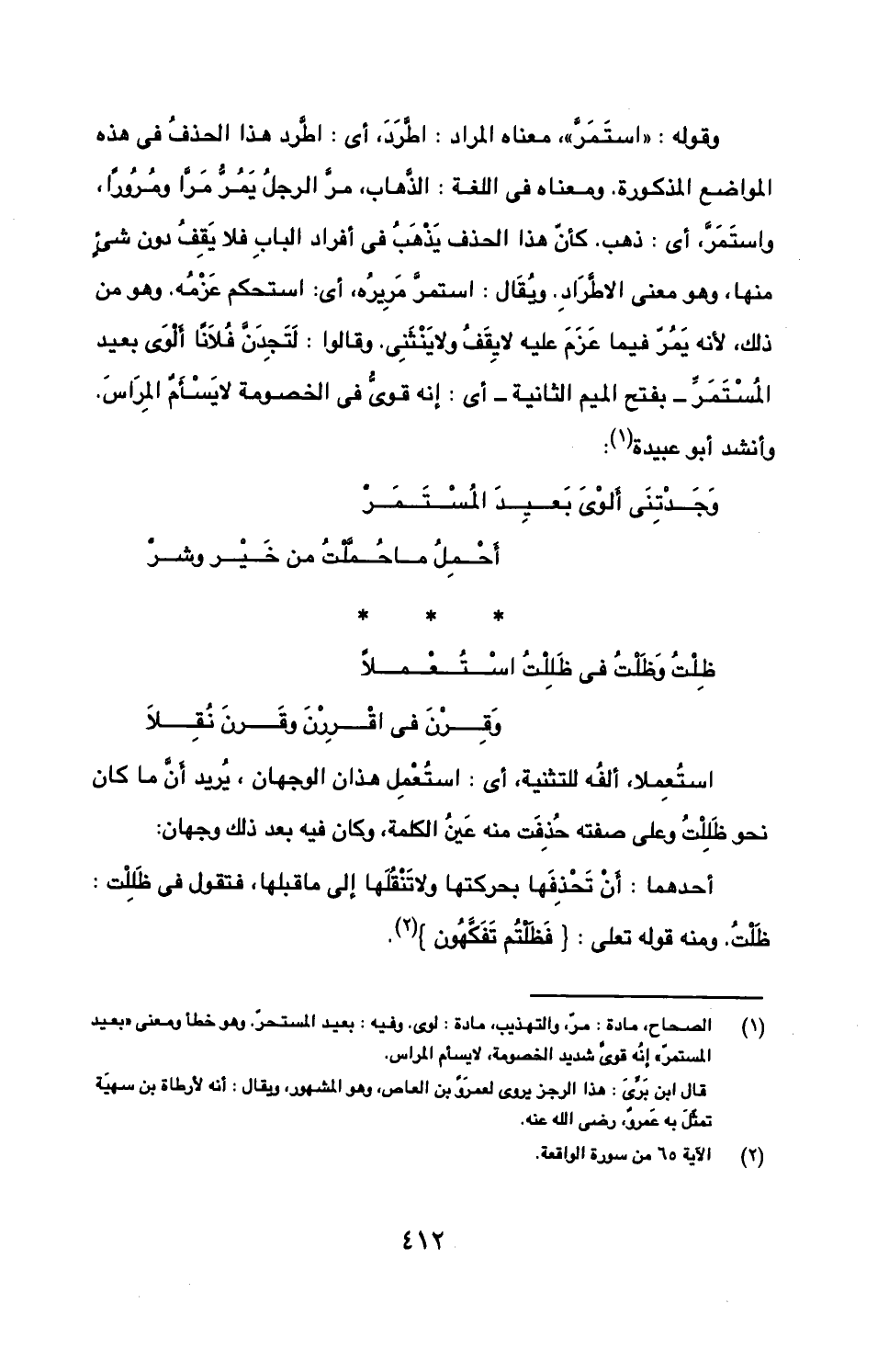 وقوله: "استمر"، معناه المراد: اطرد، أي: اطرد هذا الحذف في هذه المواضع المذكورة. ومعناه في اللغة: الذهاب، مر الرجل يمر مرا ومرورا، واستمر، أي: ذهب. كأن هذا الحذف يذهب في أفراد الباب فلا يقف دون شيء منها، وهو معنى الاطراد. ويقال: استمر مريره، أي: استحكم عزمه. وهو من ذلك، لأنه يمر فيما عزم عليه لا يقف ولا ينثني. وقالوا: لتجدن فلانا ألوى بعيد المستمر- بفتح الميم الثانية- أي: إنه قوي في الخصومة لا يسأم المراس. وأنشد أبو عبيدة: