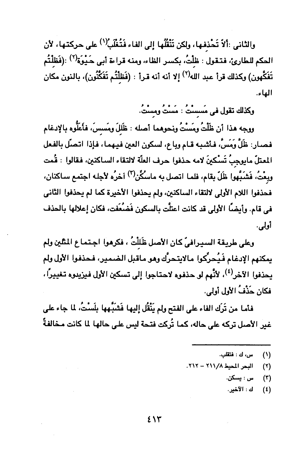 وعلى طريقة السيرافي كان الأصل ظللت، فكرهوا اجتماع المثلين ولم يمكنهم الإدغام فيحركوا ما لا يتحرك وهو ما قبل الضمير، فحذفوا الأول ولم يحذفوا الآخر، لأنهم لو حذفوه لاحتاجوا إلى تسكين الأول فيزيدوه تغييرا، فكان حذف الأول أولى.