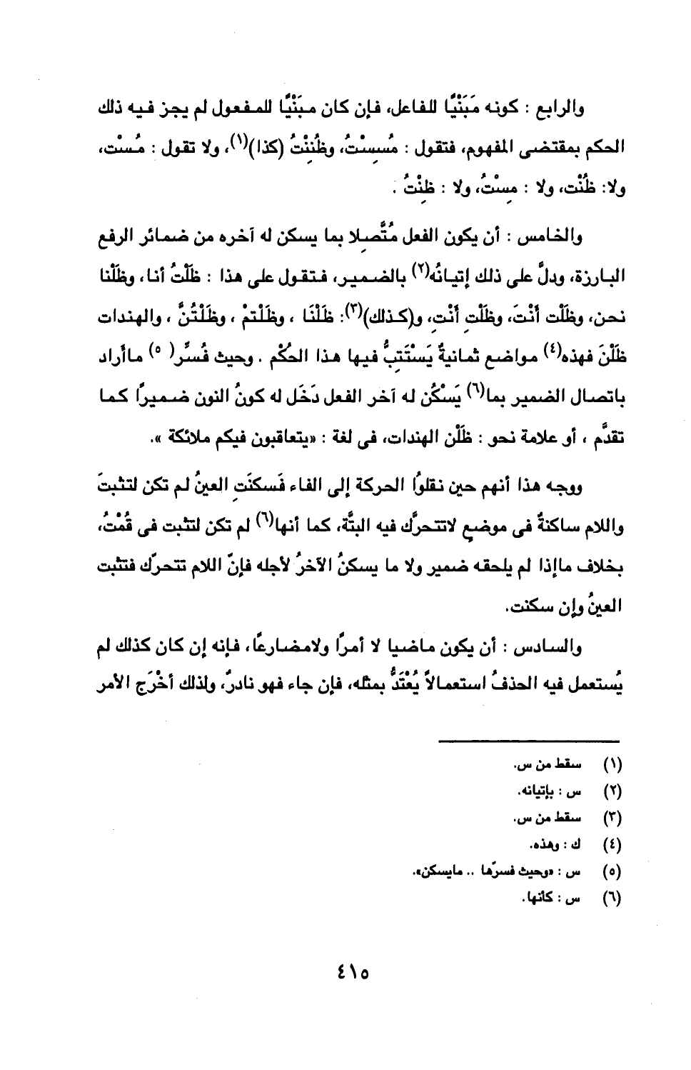والرابع: كونه مبنيا للفاعل، فإن كان مبنيا للمفعول لم يجز فيه ذلك الحكم بمقتضى المفهوم، فتقول: مسست، وظننت (كذا)، ولا تقول: مست، ولا: ظنت، ولا: مست، ولا: ظنت.
