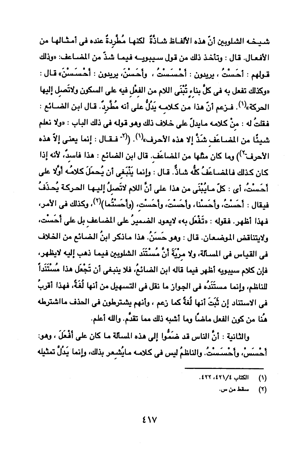 والثانية: أن الناس قد ضموا إلى هذه المسألة ما كان على أفعل، وهو: أحسس، وأحسست. والناظم ليس في كلامه ما يشعر بذلك، وإنما يدل تمثيله