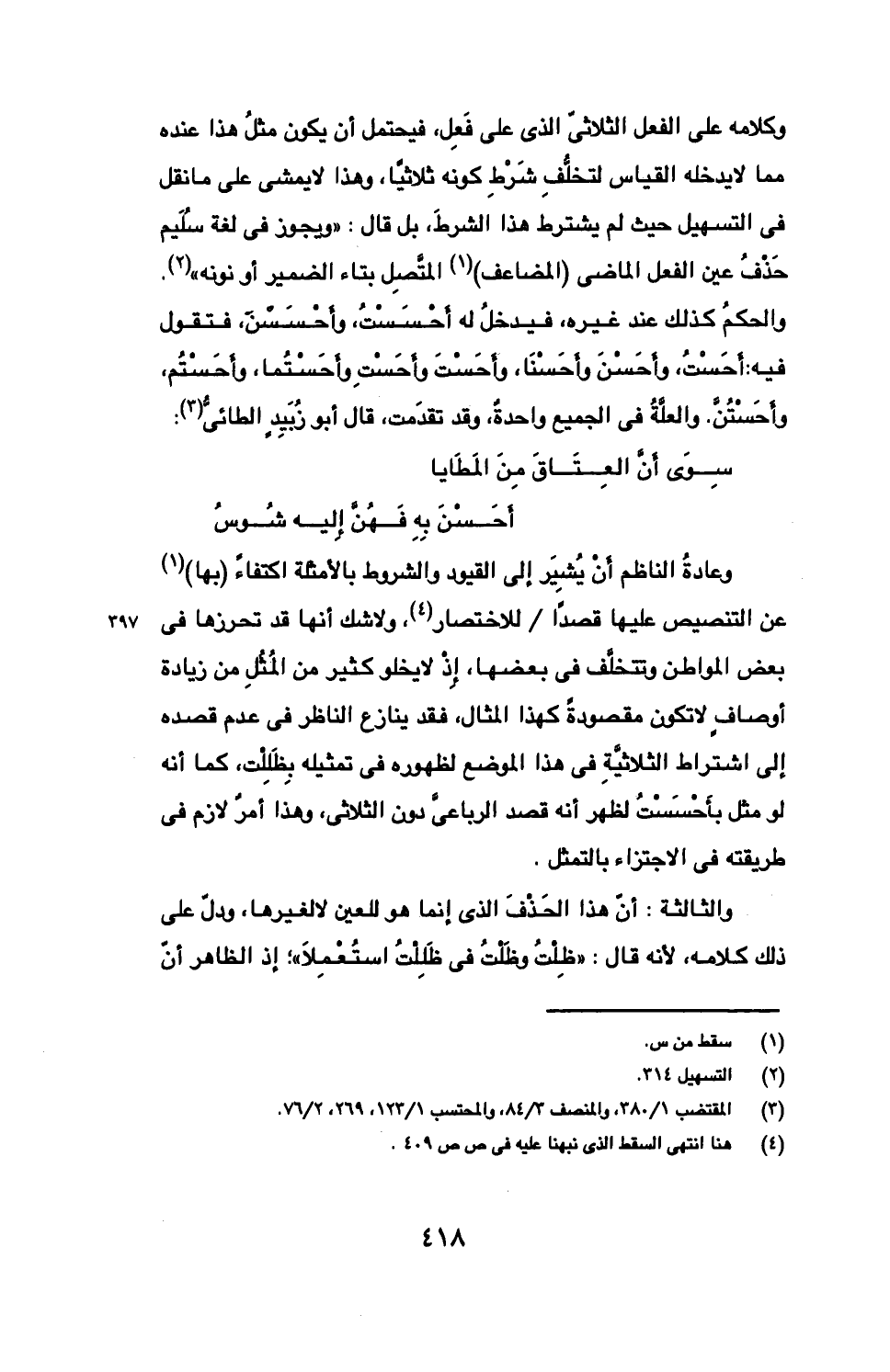 وعادة الناظم أن يشير إلى القيود والشروط بالأمثلة اكتفاء (بها) عن التنصيص عليها قصدا/ للاختصار، ولاشك أنها قد تحرزها في بعض المواطن وتتخلف في بعضها، إذ لا يخلو كثير من المثل من زيادة أوصاف لا تكون مقصودة كهذا المثال، فقد ينازع الناظر في عدم قصده إلى اشتراط الثلاثية في هذا الموضع لظهوره في تمثيله بظللت، كما أنه لو مثل بأحسست لظهر أنه قصد الرباعي دون الثلاثي، وهذا أمر لازم في طريقته في الاجتزاء بالتمثل.