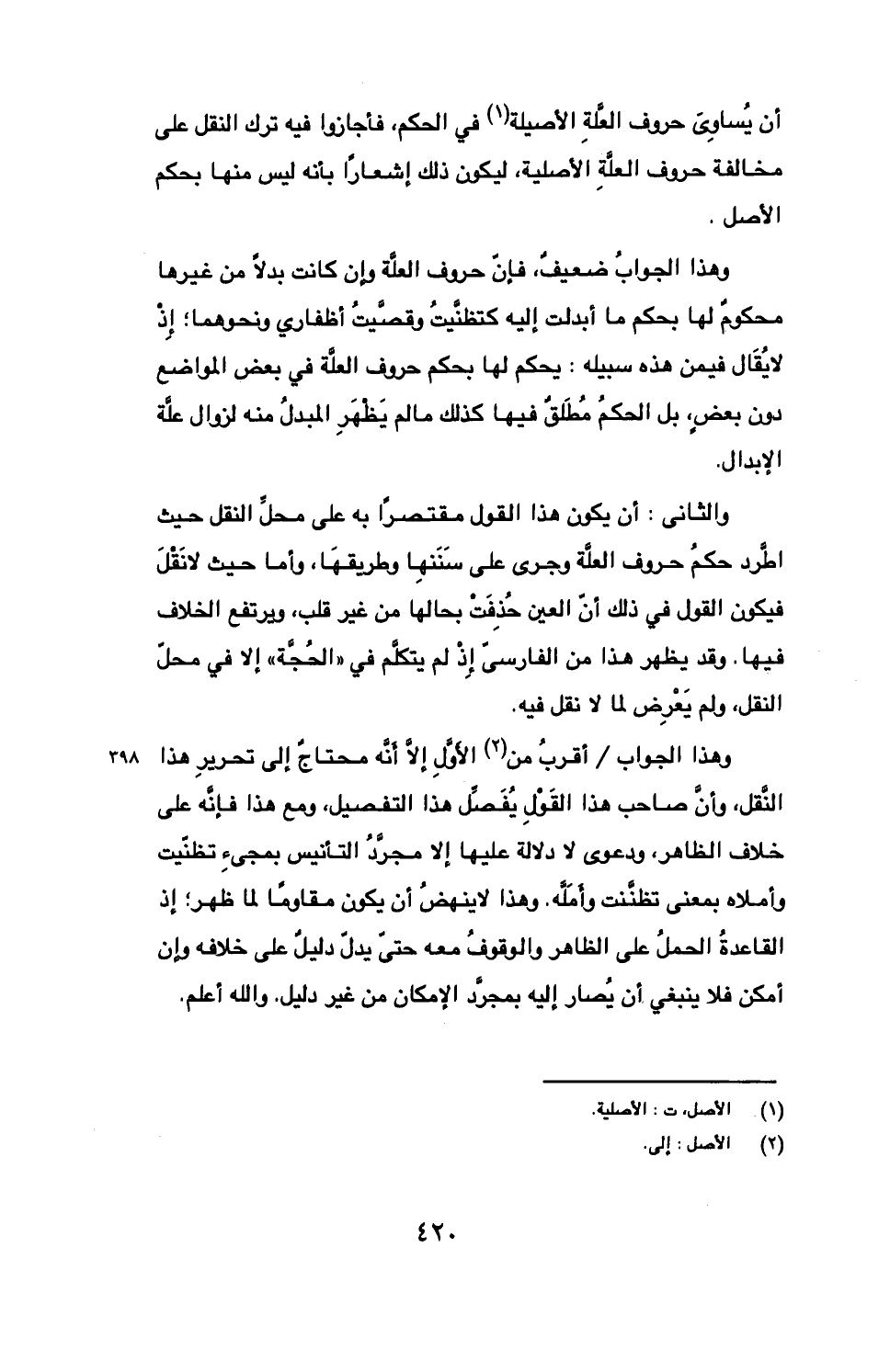 والثاني: أن يكون هذا القول مقتصرا به على محل النقل حيث اطرد حكم حروف العلة وجرى على سننها وطريقها، وأما حيث لا نقل فيكون القول في ذلك أن العين حذفت بحالها من غير قلب، ويرتفع الخلاف فيها. وقد يظهر هذا من الفارسي إذ لم يتكلم في "الحجة" إلا في محل النقل، ولم يعرض لما لا نقل فيه.