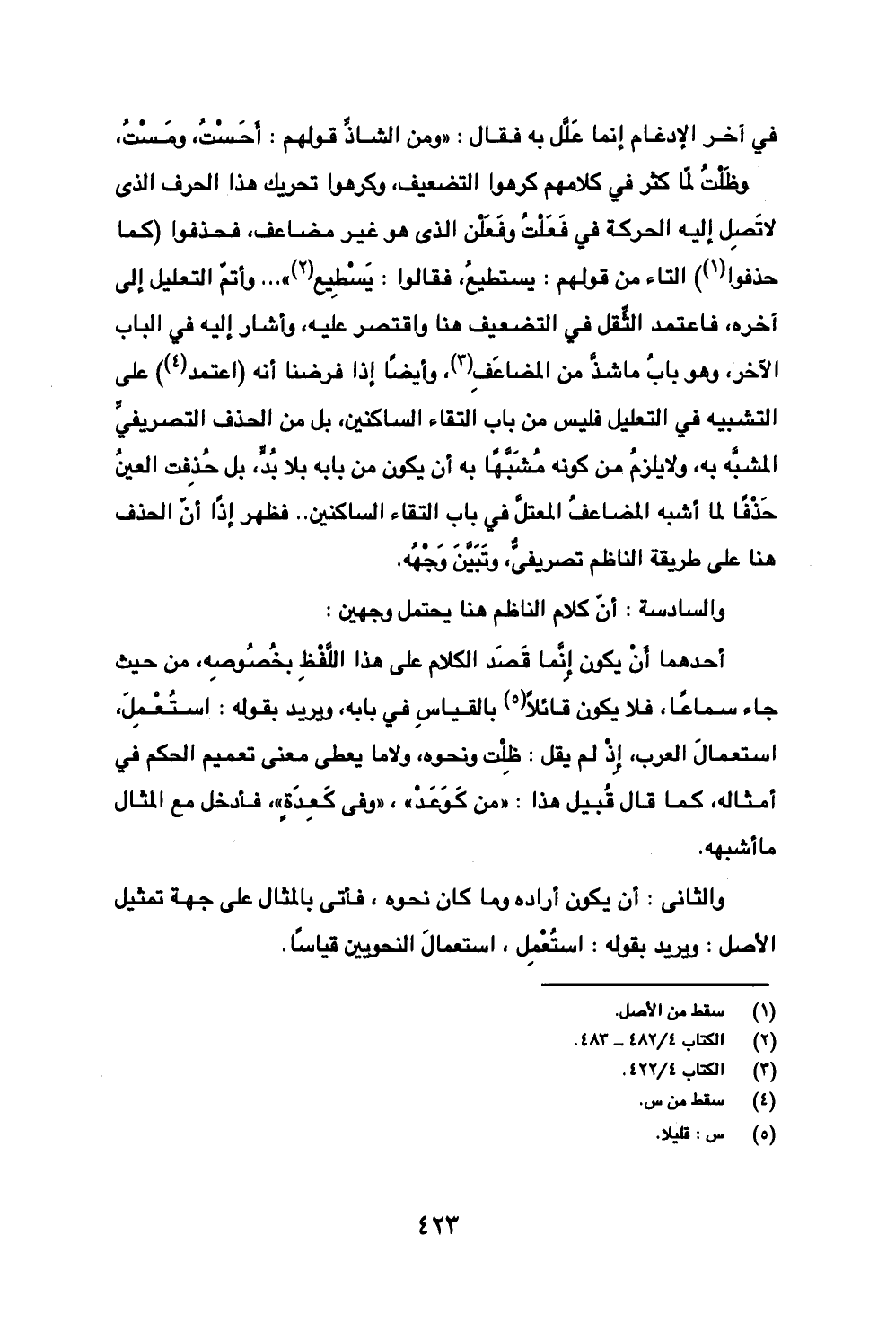 في آخر الإدغام إنما علل به فقال: "ومن الشاذ قولهم: أحست، ومست، وظلت لما كثر في كلامهم كرهوا التضعيف، وكرهوا تحريك هذا الحرف الذي لا تصل إليه الحركة في فعلت وفعلن الذي هو غير مضاعف، فحذفوا، (كما حذفوا) التاء من قولهم: يستطيع، فقالوا: يسطيع" ... وأتم التعليل إلى آخره، فاعتمد الثقل في التضعيف هنا واقتصر عليه، وأشار إليه في الباب الآخر، وهو باب ما شذ من المضاعف، وأيضا إذا فرضنا أنه (اعتمد) على التشبيه في التعليل فليس من باب التقاء الساكنين، بل من الحذف التصريفي المشبه به، ولا يلزم من كونه مشبها به أن يكون من بابه بلا بد، بل حذفت العين حذفا لما أشبه المضاعف المعتل في باب التقاء الساكنين .. فظهر إذا أن الحذف هنا على طريقة الناظم تصريفي، وتبين وجهه.