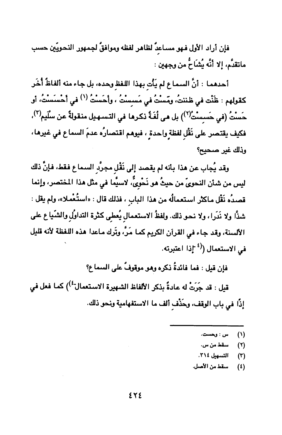 أحدهما: أن السماع لم يأت بهذا اللفظ وحده، بل جاء منه ألفاظ أخر كقولهم: ظنت في ظننت، ومست في مسست، وأحست في أحسست، أو حست (في حسست) بل هي لغة ذكرها في التسهيل منقولة عن سليم، فكيف يقتصر على نقل لفظة واحدة، فيوهم اقتصاره عدم السماع في غيرها، وذلك غير صحيح؟