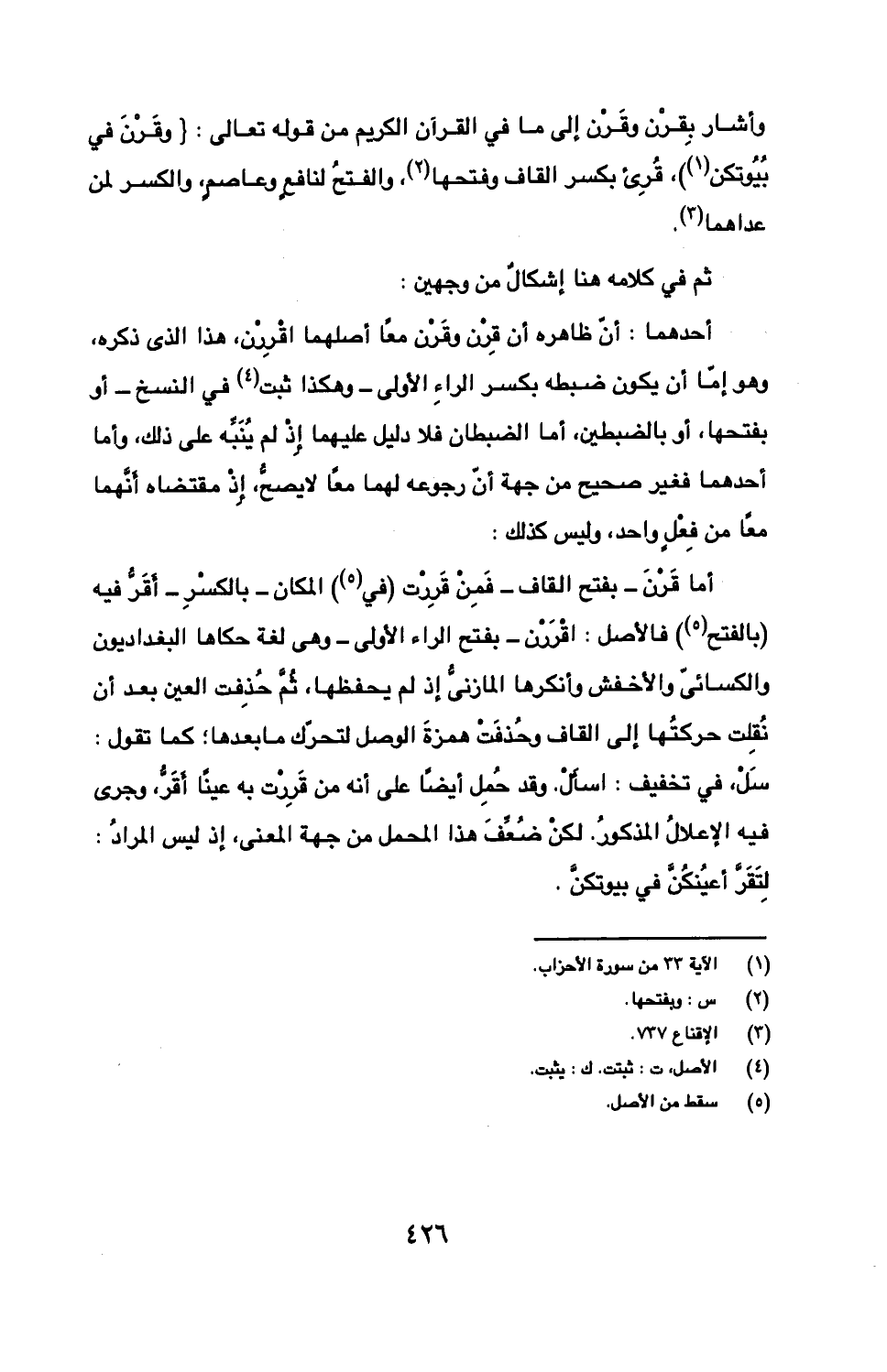أما قرن- بفتح القاف- فن قررت (في) المكان- بالكسر- أقر فيه (بالفتح) فالأصل: اقررن- بفتح الراء الأولى- وهي لغة حكاها البغداديون والكسائي والأخفش وأنكرها المازني إذ لم يحفظها، ثم حذفت العين بعد أن نقلت حركتها إلى القاف وحذفت همزة الوصل لتحرك ما بعدها؛ كما تقول: سل، في تخفيف، اسأل. وقد حمل أيضا على أنه من قررت به عينا أقر، وجرى فيه الإعلال المذكور. لكن ضعف هذا المحمل من جهة المعنى، إذ ليس المراد: لتقر أعينكن في بيوتكن.