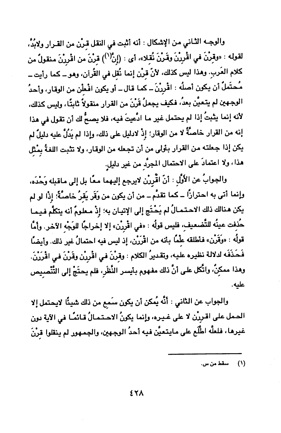 والجواب عن الثاني: أنه يمكن أن يكون سمع من ذلك شيئا لا يحتمل إلا الحمل على اقررن لا على غيره، وإنا يكون الاحتمال قائما في الآية دون غيرها، فلعله اطلع على ما يتعين فيه أحد الوجهين، والجمهور لم ينقلوا قرن