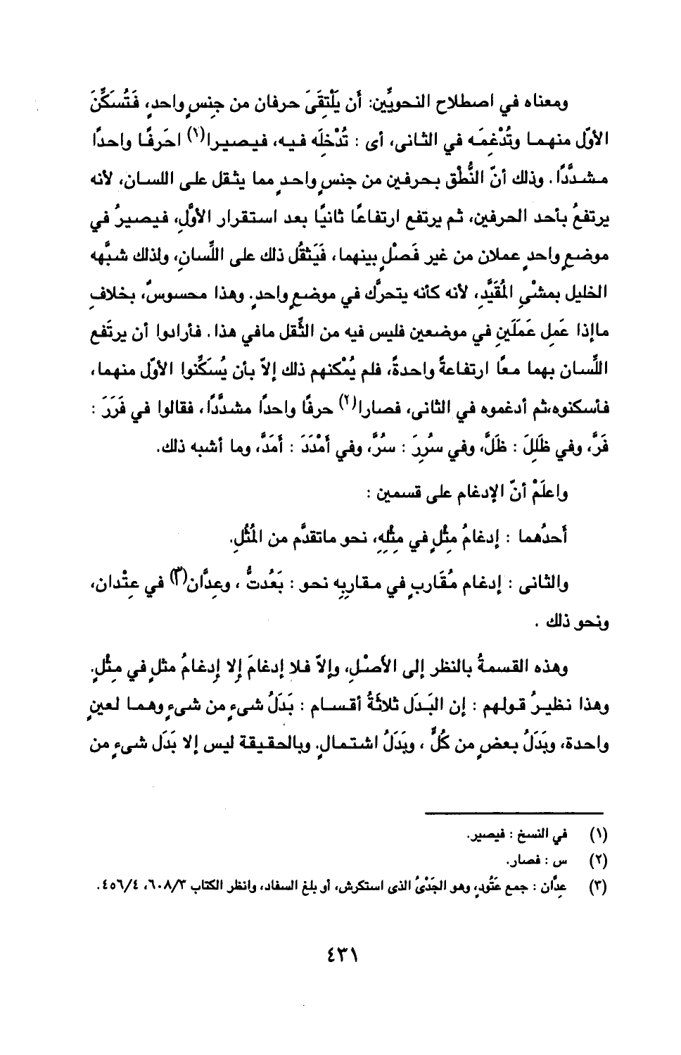 وهذه القسمة بالنظر إلى الأصل، وإلا فلا إدغام إلا إدغام مثل في مثل. وهذا نظير قولهم: إن البدل ثلاثة أقسام: بدل شيء من شيء وهما لعين واحدة، وبدل بعض من كل، وبدل اشتمال. وبالحقيقة ليس إلا بدل شيء من
