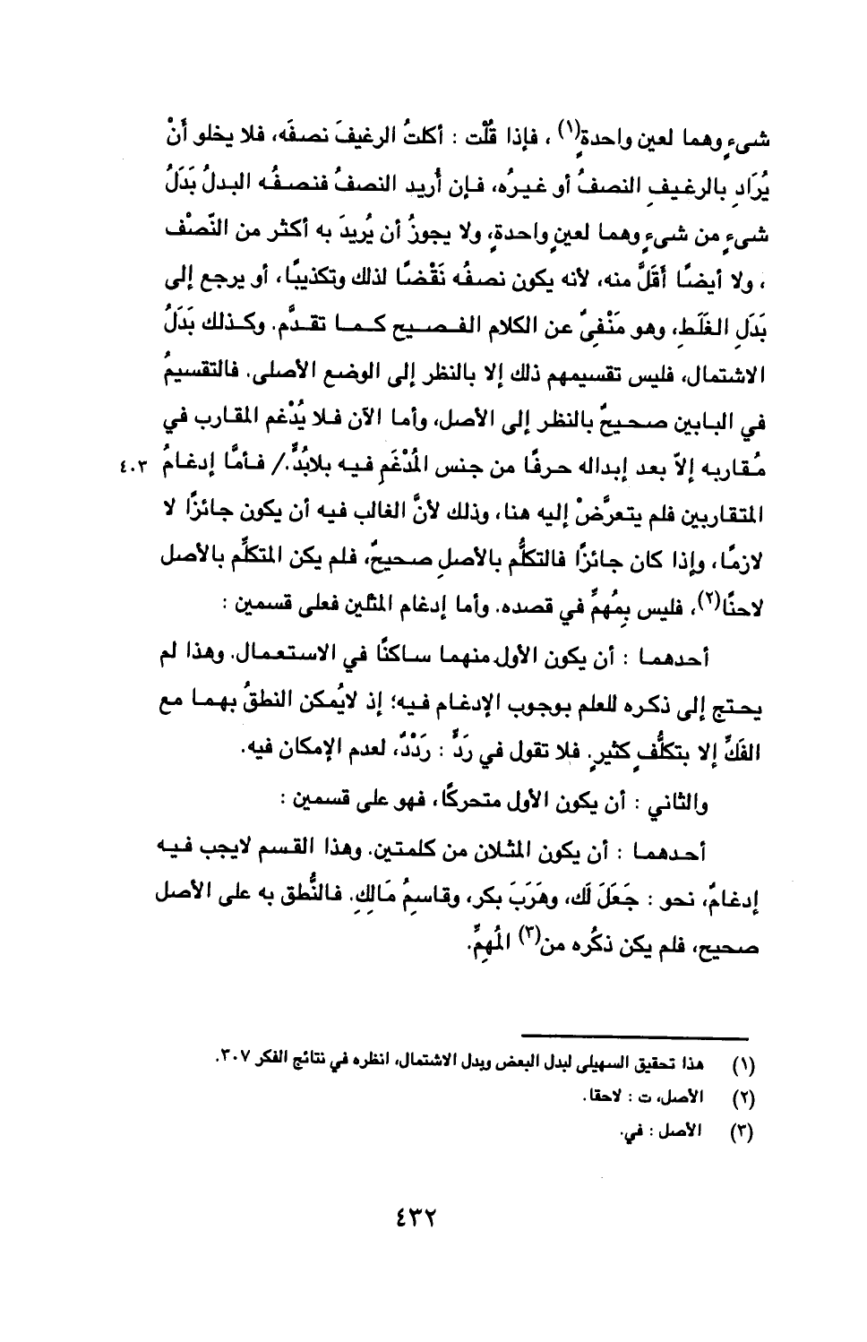 شيء وهما لعين واحدة، فإذا قلت: أكلت الرغيف نصفه، فلا يخلو أن يراد بالرغيف النصف أو غيره، فإن أريد النصف فنصفه البدل بدل شيء من شيء وهما لعين واحدة، ولا يجوز أن يريد به أكثر من النصف، ولا أيضا أقل منه، لأنه يكون نصفه نقضا لذلك وتكذيبا، أو يرجع إلى بدل الغلط، وهو منفي عن الكلام الفصيح كما تقدم. وكذلك بدل الاشتمال، فليس تقسيمهم ذلك إلا بالنظر إلى الوضع الأصلي. فالتقسيم في البأبين صحيح بالنظر إلى الأصل، وأما الآن فلا يدغم المقارب في مقاربه إلا بعد إبداله حرفا من جنس المدغم فيه بلابد./ فأما إدغام المتقاربين فلم يتعرض إليه هنا، وذلك لأن الغالب فيه أن يكون جائزا لا لازما، وإذا كان جائزا فالتكلم بالأصل صحيح، فلم يكن المتكلم بالأصل لاحنا، فليس بمهم في قصده. وأما إدغام المثلين فعلى قسمين: