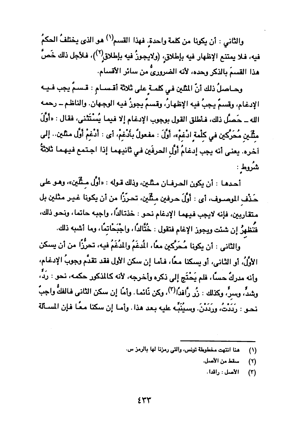 والثاني: أن يكونا محركين معا، المدغم والمدغم فيه، تحرزا من أن يسكن الأول، أو الثاني، أو يسكنا معا، فأما إن سكن الأول فقد تقدم وجوب الإدغام، وأنه مدرك حسا، فلم يحتج إل ذكره وأخرجه، لأنه كالمذكور حكمه، نحو: رد، وشد، وسر، وكذلك: زر رافدا، وكن نائما. وأما إن سكن الثاني فالفك واجب نحو: رددت، ورددن. وسينه عليه بعد هذا. وأما إن سكنا معا فإن المسألة