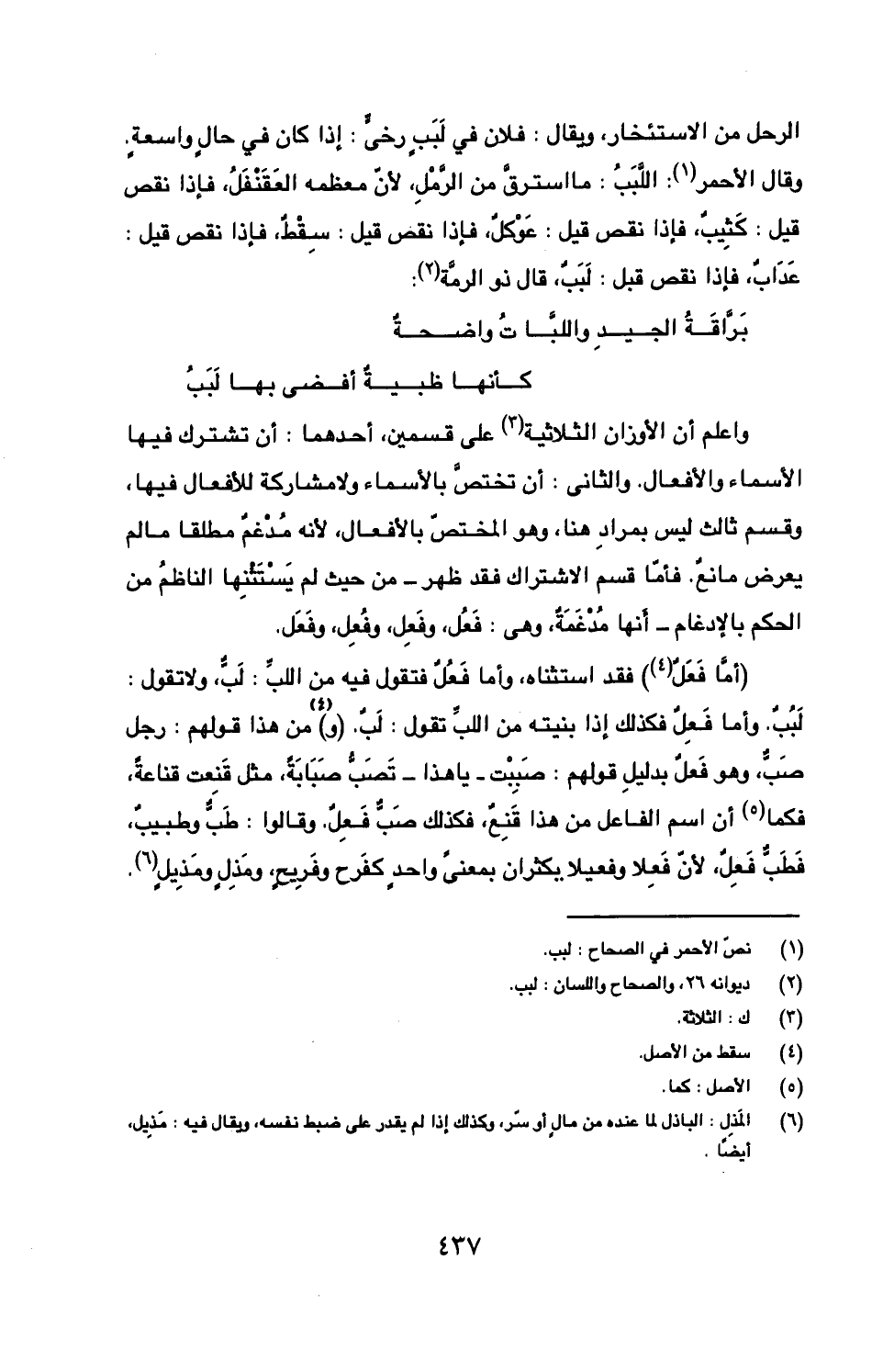 (أما فعل) فقد استثناه، وأما فعل فتقول فيه من اللب: لب، ولا تقول: لبب. وأما فعل فكذلك إذا بنيته من اللب تقول: لب. (و) من هذا قولهم: رجل صب، وهو فعل بدليل قولهم: صببت- يا هذا- تصب صبابة، مثل قنعت قناعة، فكما أن اسم الفاعل من هذا قنع، فكذلك صب فعل. وقالوا: طب وطبيب، فطب فعل، لأن فعلا وفعيلا يكثران بمعنى واحد كفرح وفريح، ومذل ومذيل.