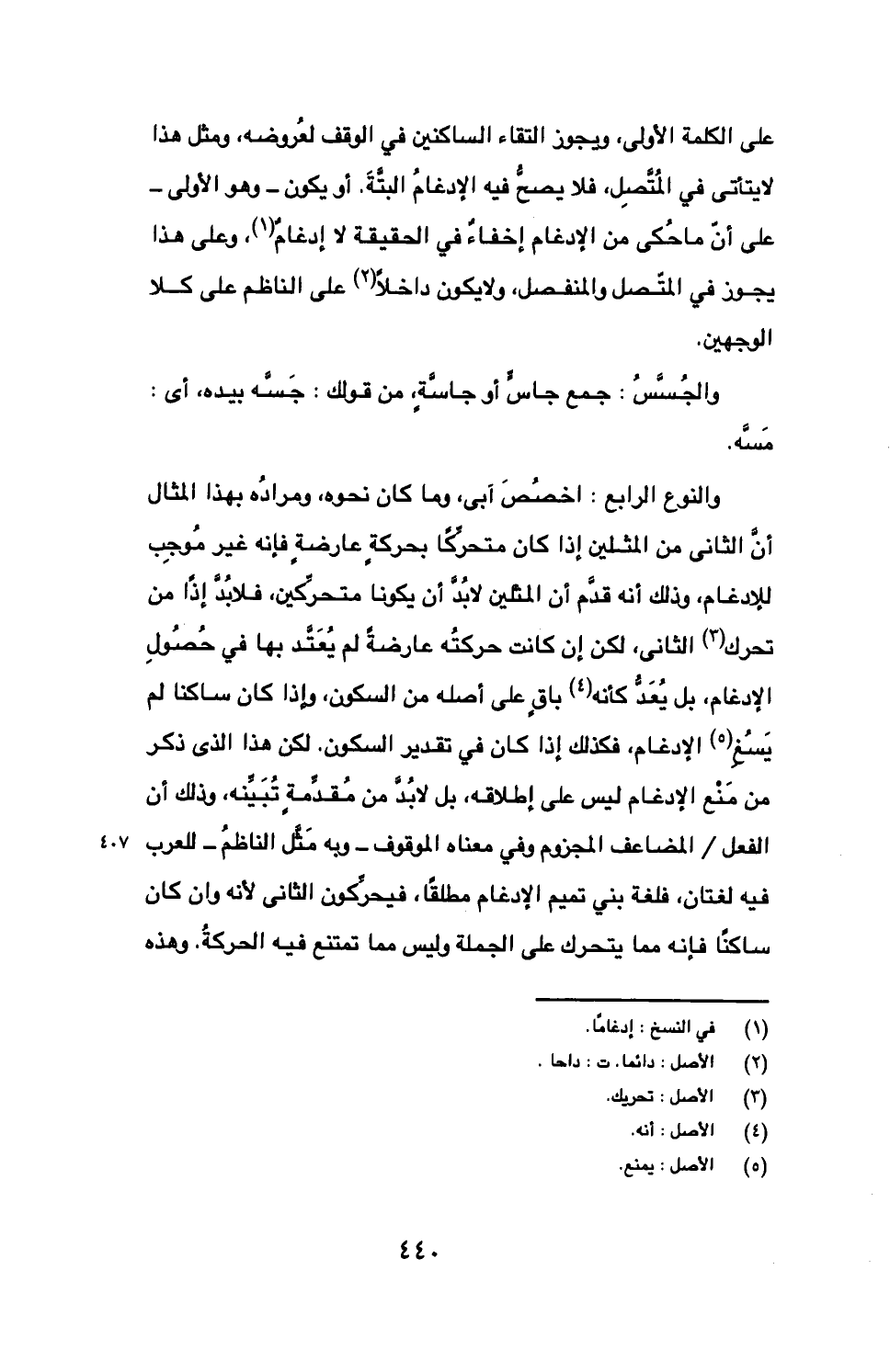 والنوع الرابع: اخصص أبي، وما كان نحوه، ومراده بهذا المثال أن الثاني من المثلين إذا كان متحركا بحركة عارضة فإنه غير موجب للإدغام، وذلك أنه قدم أن المثلين لابد أن يكونا متحركين، فلابد إذا من تحرك الثاني، لكن إن كانت حركته عارضة لم يعتد بها في حصول الإدغام، بل يعد كأنه باق على أصله من السكون، وإذا كان ساكنا لم يسغ الإدغام، فكذلك إذا كان في تقدير السكون. لكن هذا الذي ذكر من منع الإدغام ليس على إطلاقه، بل لابد من مقدمة تبينه، وذلك أن الفعل/ المضاعف المجزوم وفي معناه الموقوف- وبه مثل الناظم- للعرب فيه لغتان، فلغة بني تميم الإدغام مطلقا، فيحركون الثاني لأنه وإن كان ساكنا فإنه مما يتحرك على الجملة وليس مما تمتنع فيه الحركة. وهذه
