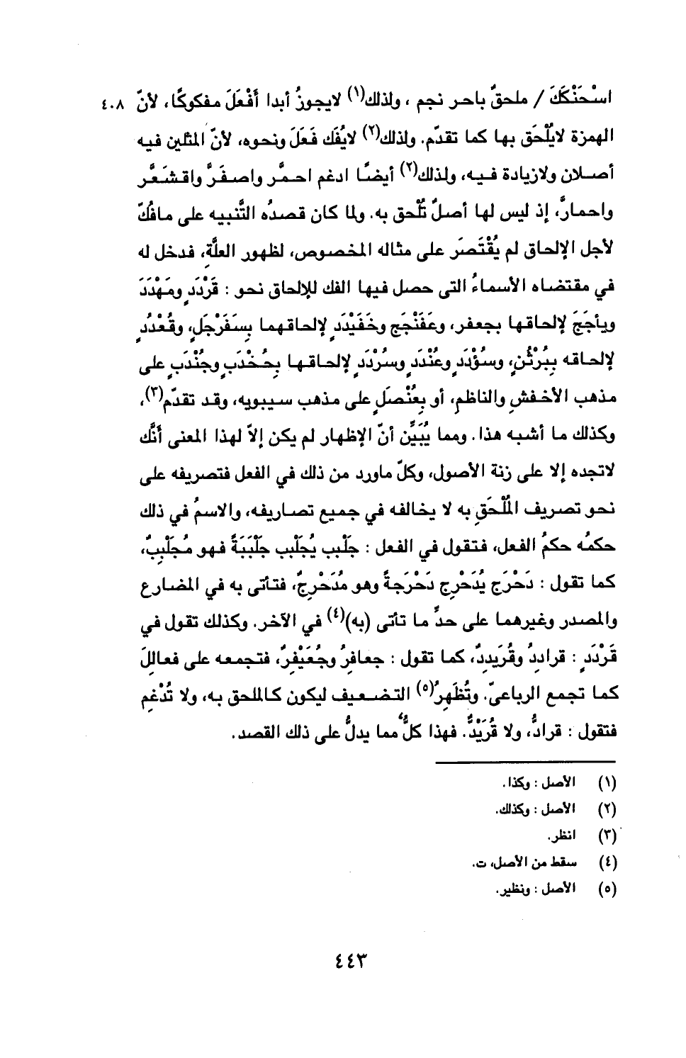 اسحنكك/ ملحق باحر نجم، ولذلك لا يجوز أبدا أفعل مفكوكا، لأن الهمزة لا يلحق بها كما تقدم. ولذلك لا يفك فعل ونحوه، لأن المثلين فيه أصلان ولا زيادة فيه، ولذلك أيضا ادغم احمر واصفر واقشعر واحمار، غذ ليس لها أصل تلحق به. ولما كان قصده التنبيه على ما فك لأجل الإلحاق لم يقتصر على مثاله المخصوص، لظهور العلة، فدخل له في مقتضاه الأسماء التي حصل فيها الفك للإلحاق نحو: قردد ومهدد ويأجج لإلحاقها بجعفر، وعفنجج وخفيدد لإلحاقهما بسفرجل، وقعدد لإلحاقه ببرثن، وسؤدد وعندد وسردد لإلحاقها بحخدب وجندب على مذهب الأخفش والناظم، أو بعنصل على مذهب سيبويه، وقد تقدم، وكذلك ما أشبه هذا. ومما يبين أن الإظهار لم يكن إلا لهذا المعنى أنك لا تجده إلا على زنة الأصول، وكل ما ورد من ذلك في الفعل فتصريفه على نحو تصريف الملحق به لا يخالفه في جميع تصاريفه، والاسم في ذلك حكمه حكم الفعل، فتقول في الفعل: جلبب يجلبب جلببة فهو مجلبب، كما تقول: دحرج يدحرج دحرجة وهو مدحرج، فتأتي به في المضارع والمصدر وغيرهما على حد ما تأتي (به) في الآخر. وكذلك تقول في قردد: قرادد وقريدد، كما تقول: جعافر وجعيفر، فتجمعه على فعالل كما تجمع الرباعي. وتظهر التضعيف ليكون كالملحق به، ولا تدغم فتقول: قراد، ولا قريد. فهذا كل مما يدل على ذلك القصد.