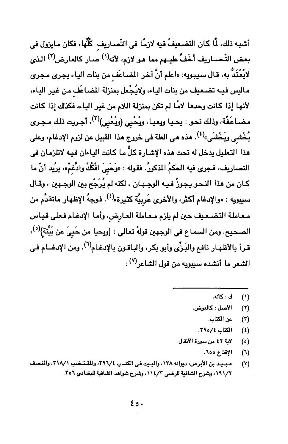 أشبه ذلك، لما كان التضعيف فيه لازما في التصاريف كلها، فكان ما يزول في بعض التصاريف أخف عليهم مما هو لازم، لأنه صار كالعارض الذي لا يعتد به، قال سيبويه: "اعلم أن آخر المضاعف من بنات الياء يجري مجرى ما ليس فيه تضعيف من بنات الياء، ولا يجعل بمنزلة المضاعف من غير الياء، لأنها إذا كانت وحدها لاما لم تكن بمنزلة اللام من غير الياء، فكذلك إذا كانت مضاعفة، وذلك نحو: يحيا ويعيا، ويحيى، (ويعيى)، أجريت ذلك مجرى يخشى ويخشى". هذه هي العلة في خروج هذا القبيل عن لزوم الإدغام، وعلى هذا التعليل يدخل له تحت هذه الإشارة كل ما كانت الياءان فيه لا تلزمان في التصاريف، فجرى فيه الحكم المذكور. فقوله: "وحيى افكك وادغم" يريد أن ما كان من هذا النحو يجوز فيه الوجهان، لكنه لم يرجح بين الوجهين، وقال سيبويه: "والإدغام أكثر، والأخرى عربية كثيرة". فوجه الإظهار ما تقدم من معاملة التضعيف حين لم يلزم معاملة العارض، وأما الإدغام فعلى قياس الصحيح. ومن السماع في الوجهين قوله تعالى: {ويحيا من حيى عن بينة}، قرأ بالإظهار نافع والبزى وأبو بكر، والباقون بالإدغام. ومن الإدغام في الشعر ما أنشده سيبويه من قول الشاعر: