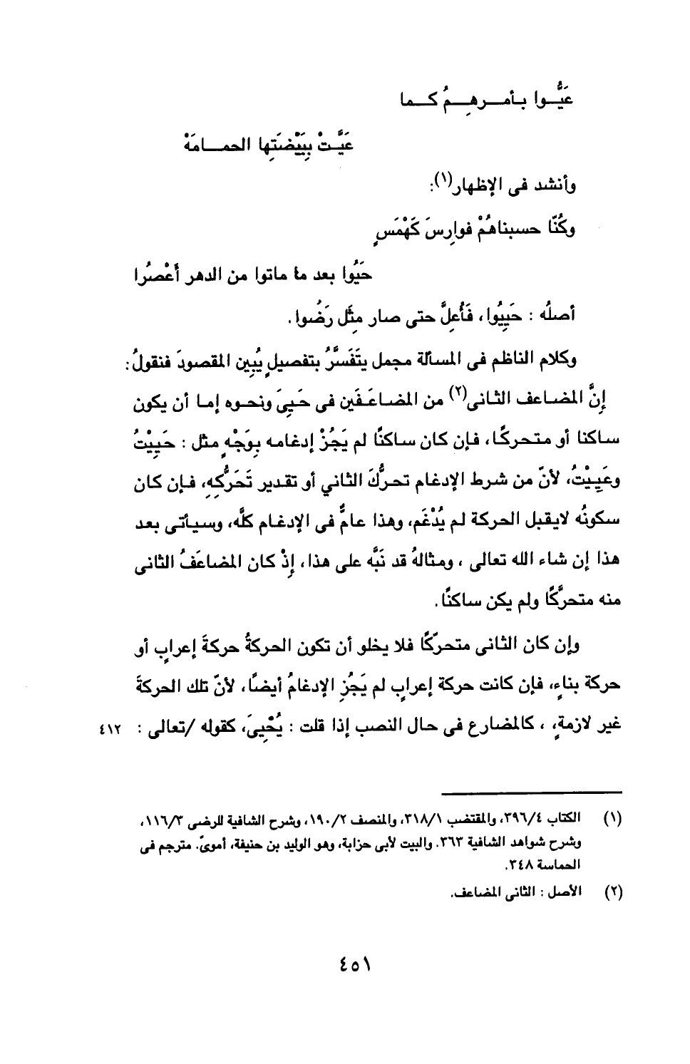 وكلام الناظم في المسألة مجمل يتفسر بتفصيل يبين المقصود فنقول: إن المضاعف الثاني من المضاعفين في حيى ونحوه إما أن يكون ساكنا أو متحركا، فإن كان ساكنا لم يجز إدغامه بوجه مثل: حييت وعييت، لأن من شرط الإدغام تحرك الثاني أو تقدير تحركه، فإن كان سكونه لا يقبل الحركة لم يدغم، وهذا عام في الإدغام كله، وسيأتي بعد هذا إن شاء الله تعالى، ومثاله قد نبه على هذا، إذ كان المضاعف الثاني منه متحركا ولم يكن ساكنا.