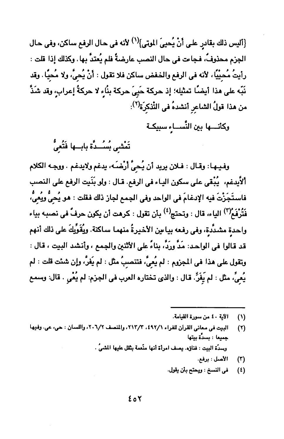 {أليس ذلك بقادر على أن يحيى الموتى} لأنه في حال الرفع ساكن، وفي حال الجزم محذوف، فجاءت في حال النصب عارضة فلم يعتد بها. وكذلك إذا قلت: رأيت محييا، لأنه في الرفع والخفض ساكن فلا تقول: أن يحى، ولا محيا. وقد نبه على هذا أيضا تمثيله؛ إذ حركة حيى حركة بناء لا حركة إعراب، وقد شذ من هذا قول الشاعر أنشده في التذكرة: