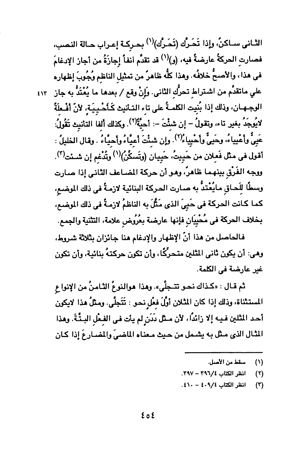 فالحاصل من هذا أن الإظهار والإدغام هنا جائزان بثلاثة شروط، وهي: أن يكون ثاني المثلين متحركا، وأن تكون حركته بنائية، وأن تكون غير عارضة في الكلمة.