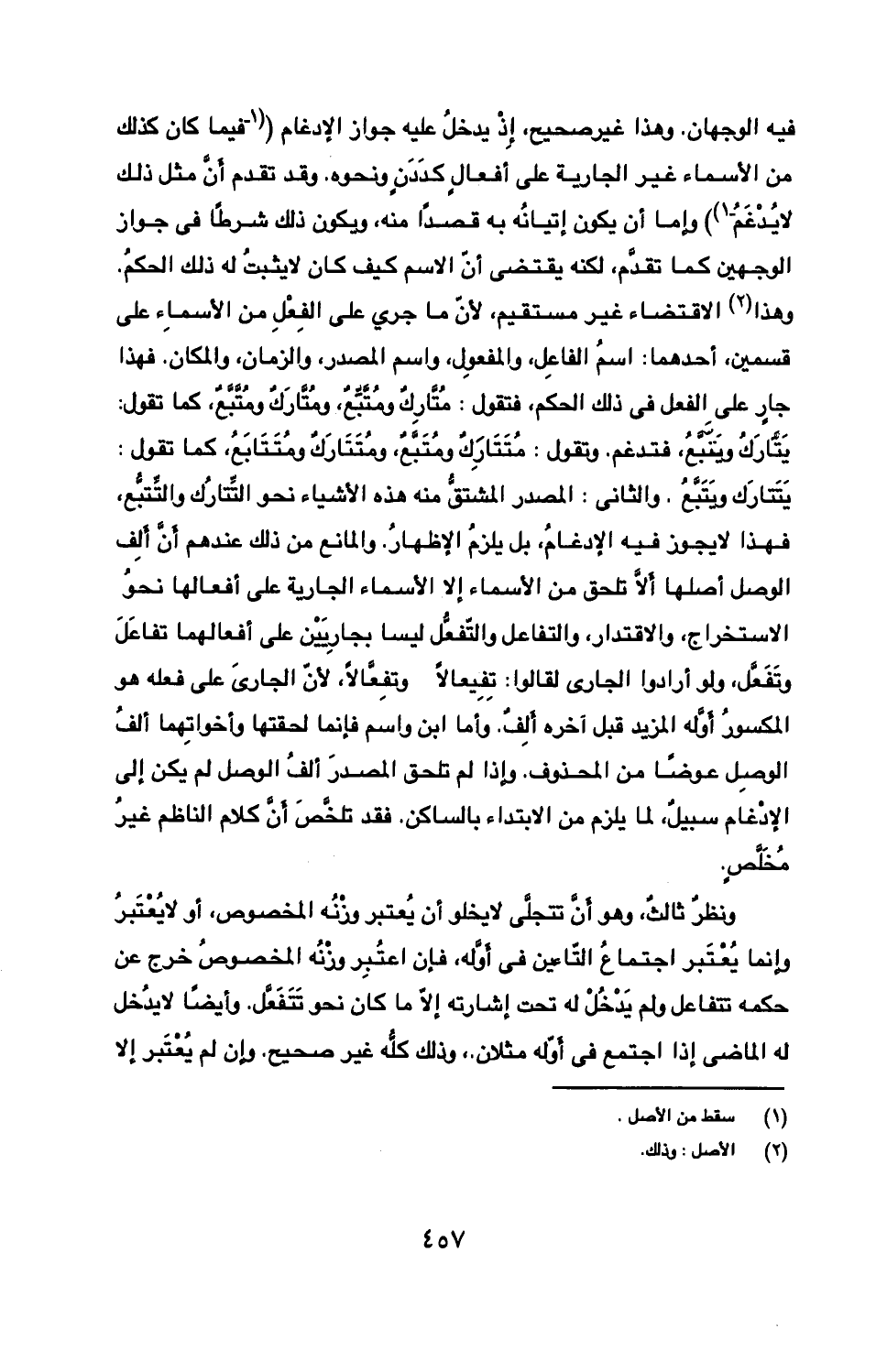 فيه الوجهان. وهذا غير صحيح، إذ يدخل عليه جواز الإدغام (فيما كان كذلك من الأسماء غير الجارية على أفعال كددن ونحوه. وقد تقدم أن مثل ذلك لا يدغم) وإما أن يكون إتيانه به قصدا منه، ويكون ذلك شرطا في جواز الوجهين كما تقدم، لكنه يقتضي أن الاسم كيف كان لا يثبت له ذلك الحكم. وهذا الاقتضاء غير مستقيم، لأن ما جرى على الفعل من الأسماء على قسمين، أحدهما: اسم الفاعل، والمفعول، واسم المصدر، والزمان، والمكان. فهذا جار على الفعل في ذلك الحكم، فتقول: متارك ومتبع، ومتارك ومتبع، كما تقول: يتارك ويتبع، فتدغم. وتقول: متتارك ومتبع، ومتتارك ومتتابع، كما تقول: يتتارك ويتبع. والثاني: المصدر المشتق منه هذه الأشياء نحو التتارك والتتبع، فهذا لا يجوز فيه الإدغام، بل يلزم الإظهار. والمانع من ذلك عندهم أن ألف الوصل أصلها ألا تلحق من الأسماء إلا الأسماء الجارية على أفعالها نحو الاستخراج، والاقتدار، والتفاعل والتفعل ليسا بجاريين على أفعالهما تفاعل وتفعل، ولو أرادوا الجاري لقالوا: تفيعالا وتفعالا، لأن الجاري على فعله هو المكسور أوله المزيد قبل آخره ألف. وأما ابن واسم فإنما لحقتها وأخواتهما ألف الوصل عوضا من المحذوف. وإذا لم تلحق المصدر ألف الوصل لم يكن إلى الإدغام سبيل، لما يلزم من الابتداء بالساكن. فقد تلخص أن كلام الناظم غير مخلص.