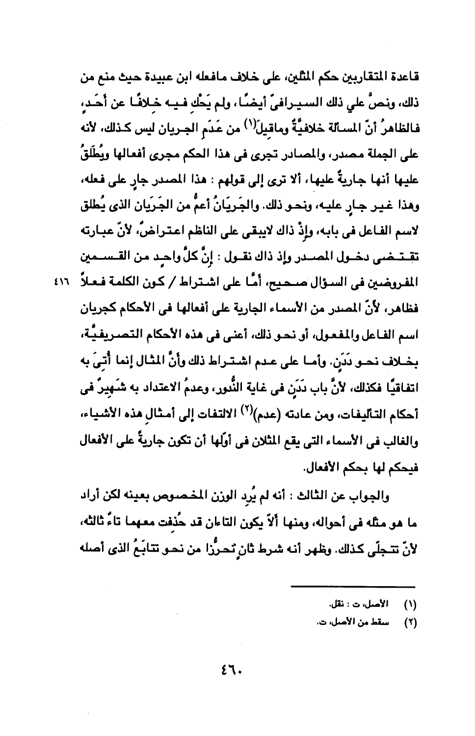 قاعدة المتقاربين حكم المثلين، على خلاف ما فعله ابن عبيدة حيث منع من ذلك، ونص على ذلك السيرافي أيضا، ولم يحك فيه خلافا عن أحد، فالظاهر أن المسألة خلافية وما قيل من عدم الجريان ليس كذلك، لأنه على الجملة مصدر، والمصادر تجري في هذا الحكم مجرى أفعالها ويطلق عليها أنها جارية عليها، ألا ترى إلى قولهم: هذا المصدر جار على فعله، وهذا غير جار عليه، ونحو ذلك. والجريان أعم من الجريان الذي يطلق لاسم الفاعل في بابه، وإذ ذاك لا يبقى على الناظم اعتراض، لأن عبارته تقتضي دخول المصدر وإذ ذاك نقول: إن كل واحد من القسمين المفروضين في السؤال صحيح، أما على اشتراط/ كون الكلمة فعلا فظاهر، لأن المصدر من الأسماء الجارية على أفعالها في الأحكام كجريان اسم الفاعل والمفعول، أو نحو ذلك، أعني في هذه الأحكام التصريفية، بخلاف نحو ددن. وأما على عدم اشتراط ذلك وأن المثال إنما أتى به اتفاقيا فكذلك، لأن باب ددن في غاية الندور، وعدم الاعتماد به شهير في أحكام التأليفات، ومن عادته (عدم) الالتفات إلى أمثال هذه الأشياء، والغالب في الأسماء التي يقع المثلان في أولها أن تكون جارية على الأفعال فيحكم لها بحكم الأفعال.