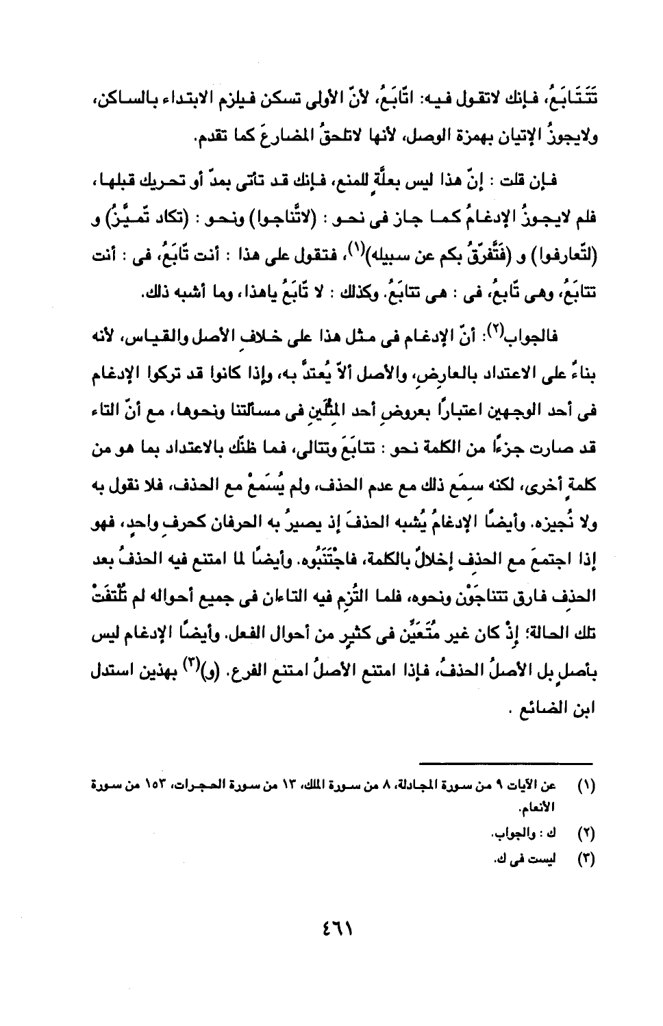 فالجواب: أن الإدغام في مثل هذا على خلاف الأصل والقياس، لأنه بناء على الاعتداد بالعارض، والأصل ألا يعتد به، وإذا كانوا قد تركوا الإدغام في أحد الوجهين اعتبارا بعروض أحد المثلين في مسألتنا ونحوها، مع أن التاء قد صارت جزءا من الكلمة نحو: تتابع وتتالى، فما ظنك بالاعتداد بما هو من كلمة أخرى، لكنه سمع ذلك مع عدم الحذف، ولم يسمع مع الحذف فلا نقول به ولا نجيزه. وأيضا الإدغام يشبه الحذف إذ يصير به الحرفان كحرف واحد، فهو إذا اجتمع مع الحذف إخلال بالكلمة، فاجتنبوه. وأيضا لما امتنع فيه الحذف بعد الحذف فارق تتناجون ونحوه، فلما التزم فيه التاءان في جميع أحواله لم تلتفت تلك الحالة؛ إذ كان غير متعين في كثير من أحوال الفعل. وأيضا الإدغام ليس بأصل بل الأصل الحذف، فإذا امتنع الأصل امتنع الفرع. (و) بهذين استدل ابن الضائع.