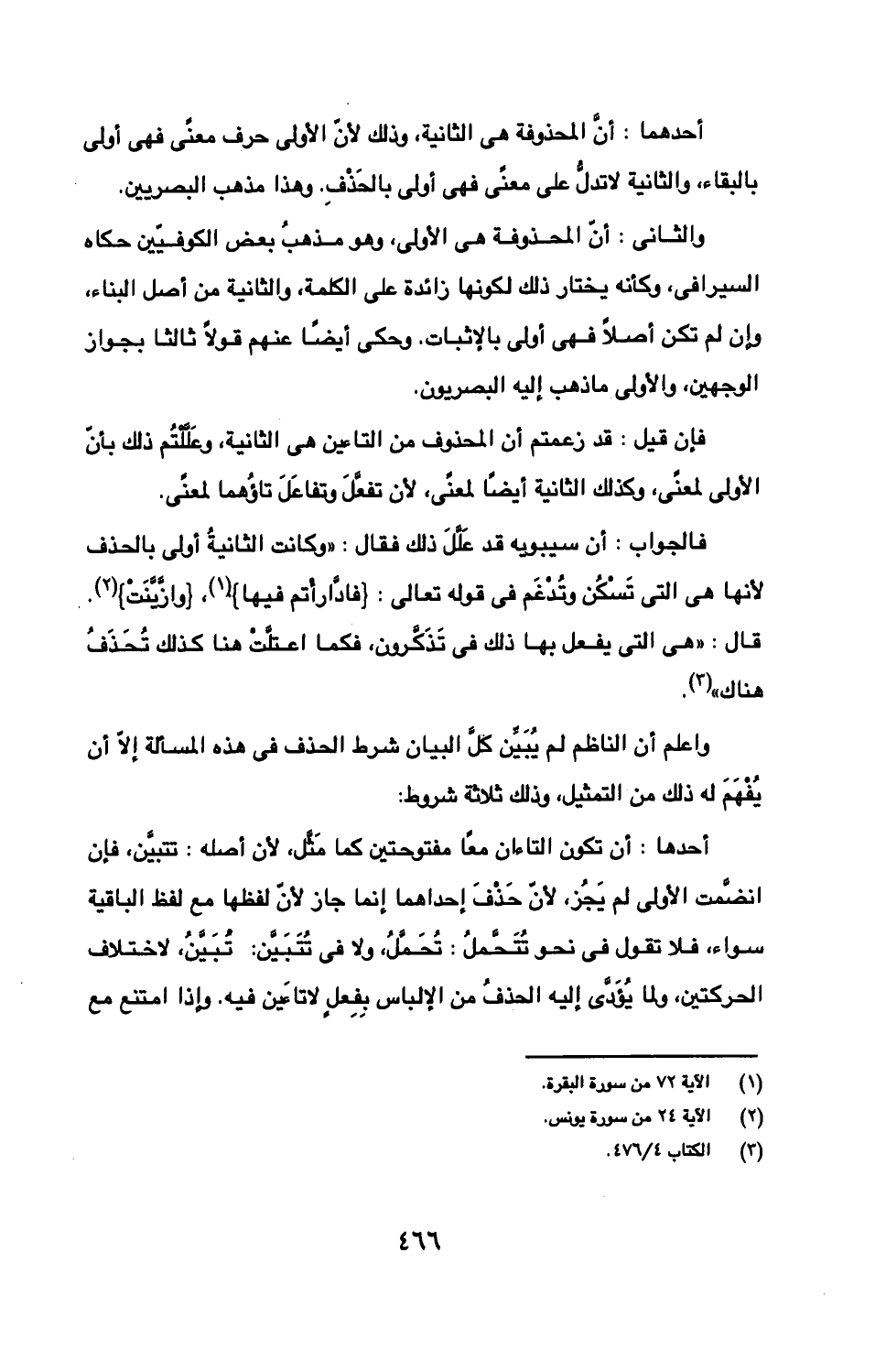 والثاني: أن المحذوفة هي الأولى، وهو مذهب بعض الكوفيين حكاه السيرافي، وكأنه يختار ذلك لكونها زائدة على الكلمة، والثانية من أصل البناء، وإن لم تكن أصلا فهي أولى بالإثبات. وحكى أيضا عنهم قولا ثالثا بجواز الوجهين، والأولى ما ذهب إليه البصريون.