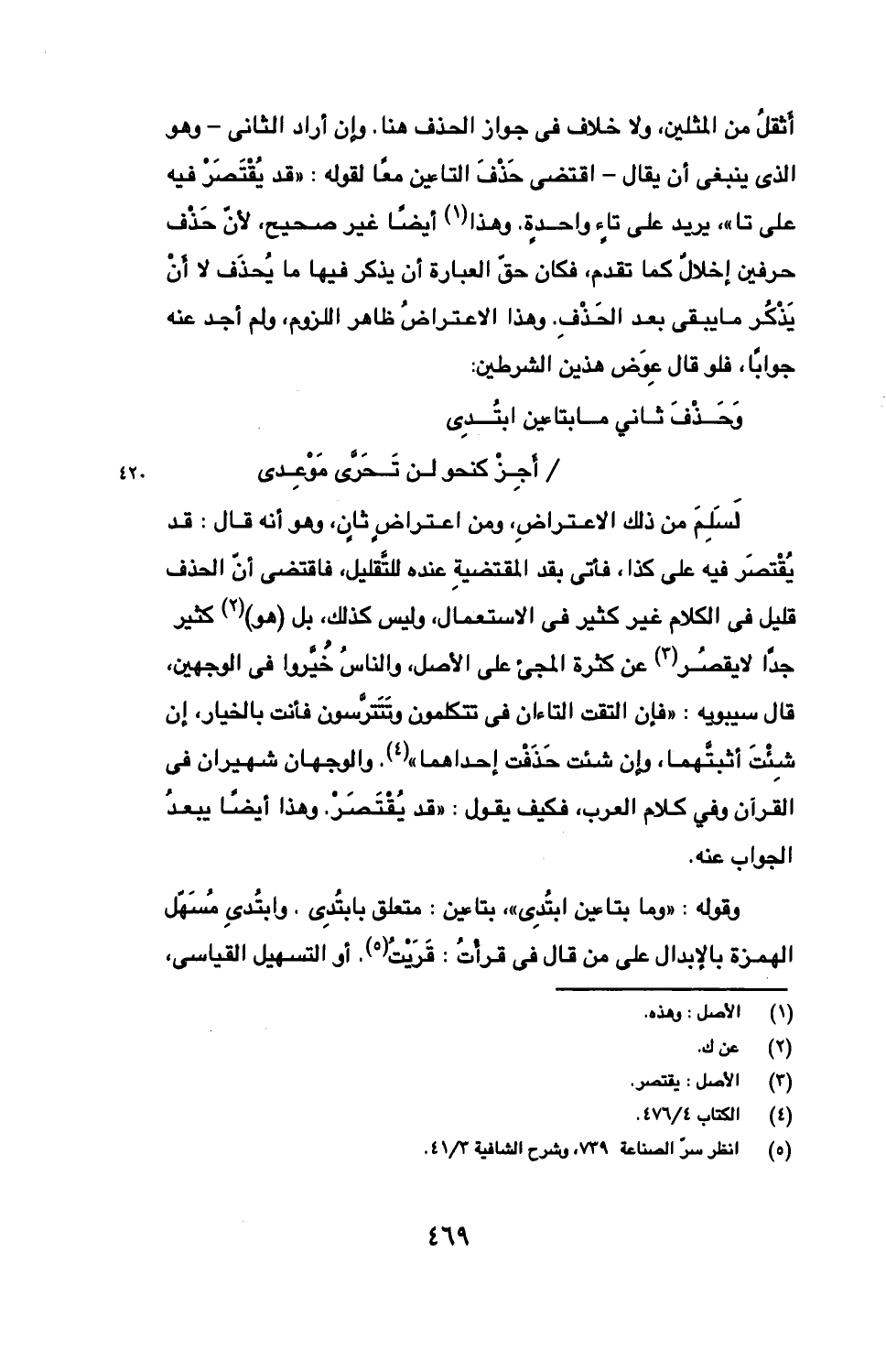 أثقل من المثلين، ولا خلاف في جواز الحذف هنا. وإن أراد الثاني- وهو الذي ينبغي أن يقال- اقتضى حذف التاءين معا لقوله: "قد يقتصر فيه على تا"، يريد على تاء واحدة. وهذا أيضا غير صحيح، لأن حذف حرفين إخلال كما تقدم، فكان حق العبارة أن يذكر فيها ما يحذف لا أن يذكر ما يبقى بعد الحذف. وهذا الاعتراض ظاهر اللزوم، ولم أجد عنه جوابا، فلو قال عوض هذين الشرطين: