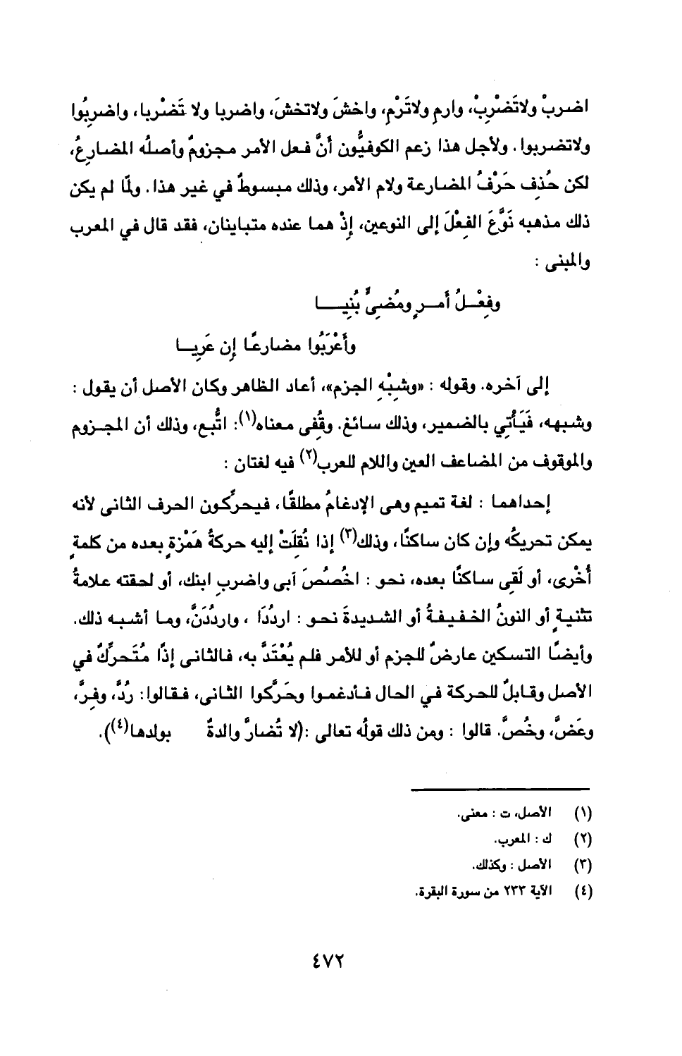 اضرب ولا تضرب، وارم ولا ترم، واخش ولا تخش، واضربا ولا تضربا، واضربوا ولا تضربوا. ولأجل هذا زعم الكوفيون أن فعل الأمر مجزوم وأصله المضارع، لكن حذف حرف المضارعة ولام الأمر، وذلك مبسوط في غير هذا. ولما لم يكن ذلك مذهبه نوع الفعل إلى النوعين، إذ هما عنده متباينان، فقد قال في المعرب والمبني: