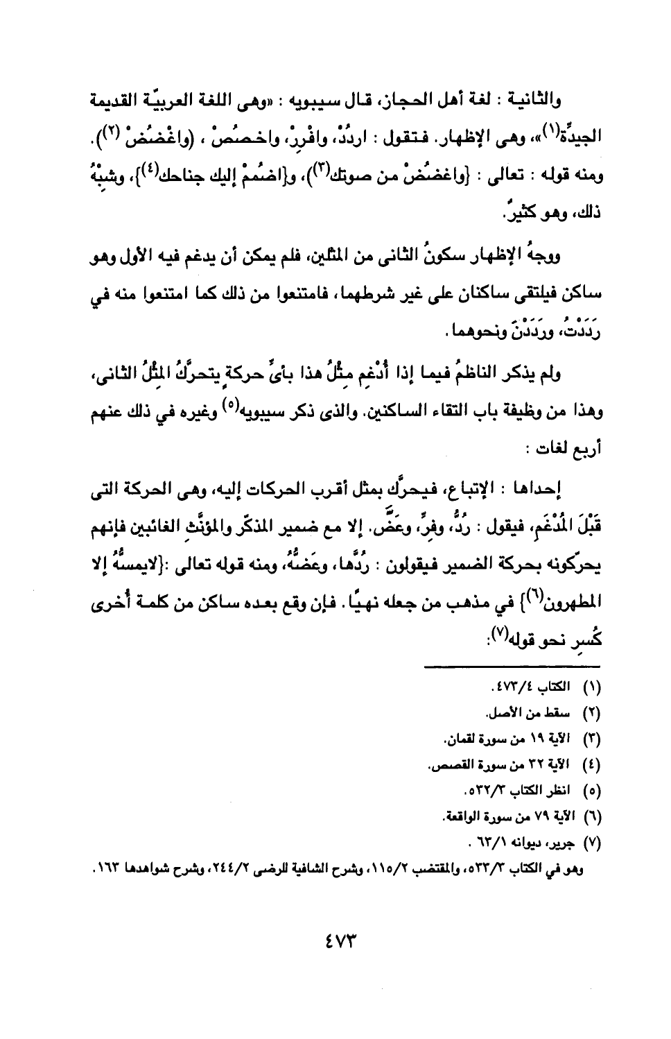 والثانية: لغة أهل الحجاز، قال سيبويه: "وهي اللغة العربية القديمة الجيدة"، وهي الإظهار. فتقول: اردد، وافرر، واخصص، (واغضض). ومنه قوله: تعالى: {واغضض من صوتك}، و {واضمم إليك جناحك}، وشبه ذلك، وهو كثير.