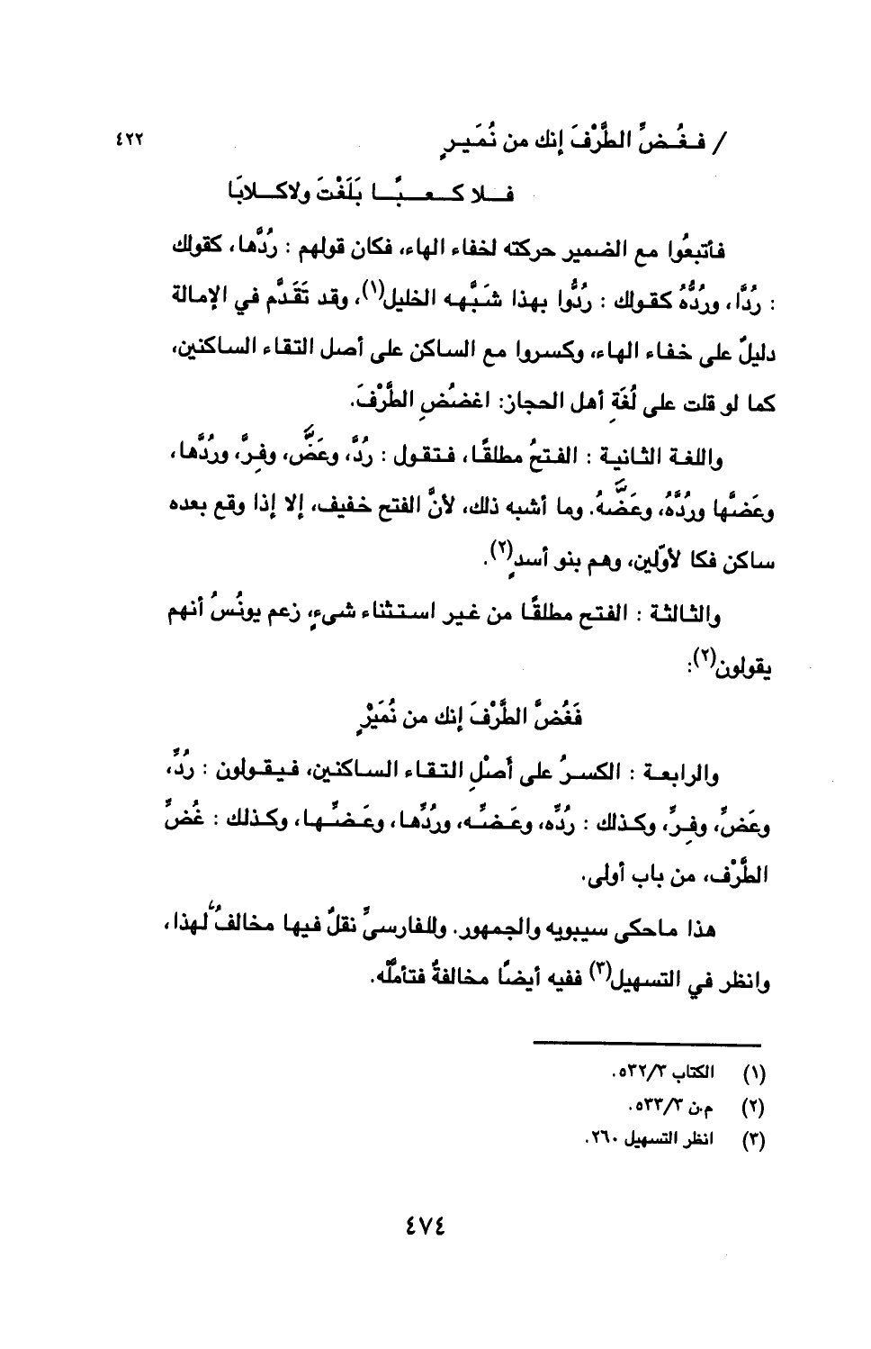 فأتبعوا مع الضمير حركته لخفاء الهاء، فكان قولهم: ردها، كقولك: ردا، ورده كقولك: ردوا بهذا شبهه الخليل، وقد تقدم في الإمالة دليل على خفاء الهاء، وكسروا مع السكن على أصل التقاء الساكنين، كما لو قلت على لغة أهل الحجاز: اغضض الطرف.