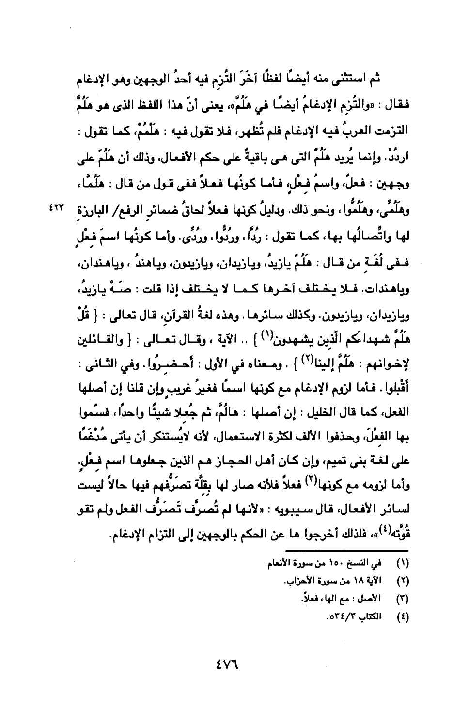 ثم استثنى منه أيضا لفظا آخر التزم فيه أحد الوجهين وهو الإدغام فقال: "والتزم الإدغام أيضا في هلم" يعني أن هذا اللفظ الذي هو هلم التزمت العرب فيه الإدغام فلم تظهر، فلا تقول فيه: هلمم، كما تقول: اردد. وإنما يريد هلم التي هي باقية على حكم الأفعال، وذلك أن هلم على وجهين: فعل، واسم فعل، فأما كونها فعلا ففي قول من قال: هلما، وهلمى، وهلموا، ونحو ذلك؟ ودليل كونها فعلا لحاق ضمائر الرفع/ البارزة لها واتصالها بها، كما تقول: ردا، وردوا، وردى. وأما كونها اسم فعل ففي لغة من قال: هلم يا زيد، ويا زيدان، ويا زيدون، ويا هند، ويا هندان، ويا هندات. فلا يختلف آخرها كما لا يختلف إذا قلت: صه يا زيد، ويا زيدان، ويا زيدون. وكذلك سائرها. وهذه لغة القرآنن قال تعالى: {قل هلم شهداءكم الذين يشهدون} .. الآية، وقال تعالى: {والقائلين لإخوانهم: هلم إلينا}. ومعناه في الأول: أحضروا. وفي الثاني: أقبلوا. فأما لزوم الإدغام مع كونها اسما فغير غريب وإن قلنا إن أصلها الفعل، كما قال الخليل: إن أصلها: هالم، ثم جعلا شيئا واحدا، فسموا بها الفعل، وحذفوا الألف لكثرة الاستعمال، لأنه لا يستنكر أن يأتي مدغما على لغة بني تميم، وإن كان أهل الحجاز هم الذين جعلوها اسم فعل. وأما لزومه مع كونها فعلا فلأنه صار لها بقلة تصرفهم فيها حالا ليست لسائر الأفعال، قال سيبويه: "لأنها لم تصرف الفعل ولم تقو قوته"، فلذلك أخرجوا ها عن الحكم بالوجهين إلى التزام الإدغام.