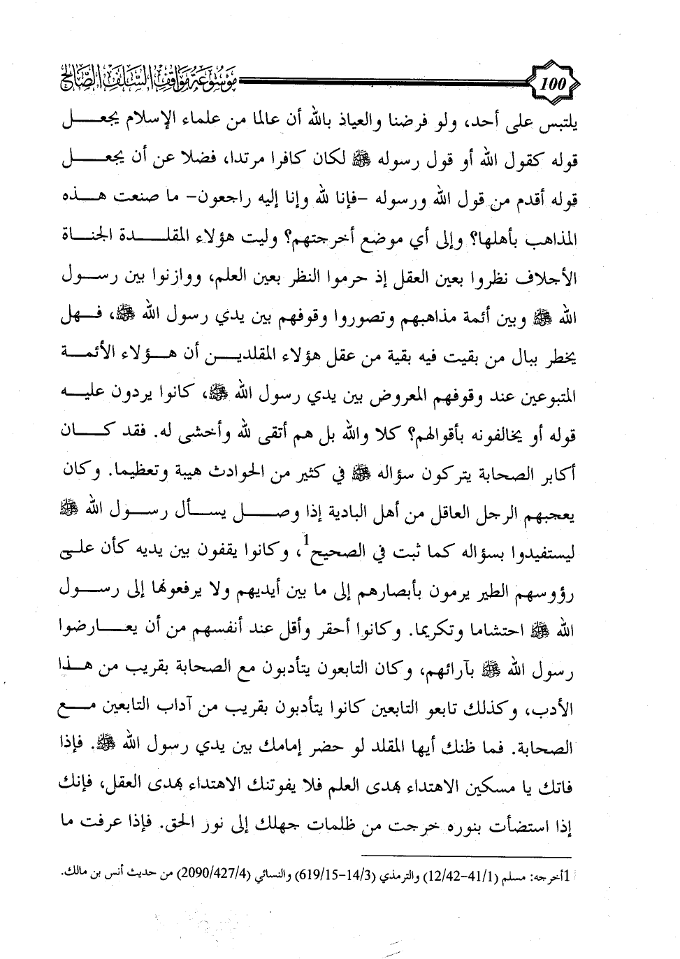 يلتبس على أحد، ولو فرضنا والعياذ بالله أن عالما من علماء الإسلام يجعل قوله كقول الله أو قول رسوله - صلى الله عليه وسلم - لكان كافرا مرتدا، فضلا عن أن يجعل قوله أقدم من قول الله ورسوله -فإنا لله وإنا إليه راجعون- ما صنعت هذه المذاهب بأهلها؟ وإلى أي موضع أخرجتهم؟ وليت هؤلاء المقلدة الجناة الأجلاف نظروا بعين العقل إذ حرموا النظر بعين العلم، ووازنوا بين رسول الله - صلى الله عليه وسلم - وبين أئمة مذاهبهم وتصوروا وقوفهم بين يدي رسول الله - صلى الله عليه وسلم -، فهل يخطر ببال من بقيت فيه بقية من عقل هؤلاء المقلدين أن هؤلاء الأئمة المتبوعين عند وقوفهم المعروض بين يدي رسول الله - صلى الله عليه وسلم -، كانوا يردون عليه قوله أو يخالفونه بأقوالهم؟ كلا والله بل هم أتقى لله وأخشى له. فقد كان أكابر الصحابة يتركون سؤاله - صلى الله عليه وسلم - في كثير من الحوادث هيبة وتعظيما. وكان يعجبهم الرجل العاقل من أهل البادية إذا وصل يسأل رسول الله - صلى الله عليه وسلم - ليستفيدوا بسؤاله كما ثبت في الصحيح (¬1)، وكانوا يقفون بين يديه كأن على رؤوسهم الطير يرمون بأبصارهم إلى ما بين أيديهم ولا يرفعونها إلى رسول الله - صلى الله عليه وسلم - احتشاما وتكريما. وكانوا أحقر وأقل عند أنفسهم من أن يعارضوا رسول الله - صلى الله عليه وسلم - بآرائهم، وكان التابعون يتأدبون مع الصحابة بقريب من هذا الأدب، وكذلك تابعو التابعين كانوا يتأدبون بقريب من آداب التابعين مع الصحابة. فما ظنك أيها المقلد لو حضر إمامك بين يدي رسول الله - صلى الله عليه وسلم -.